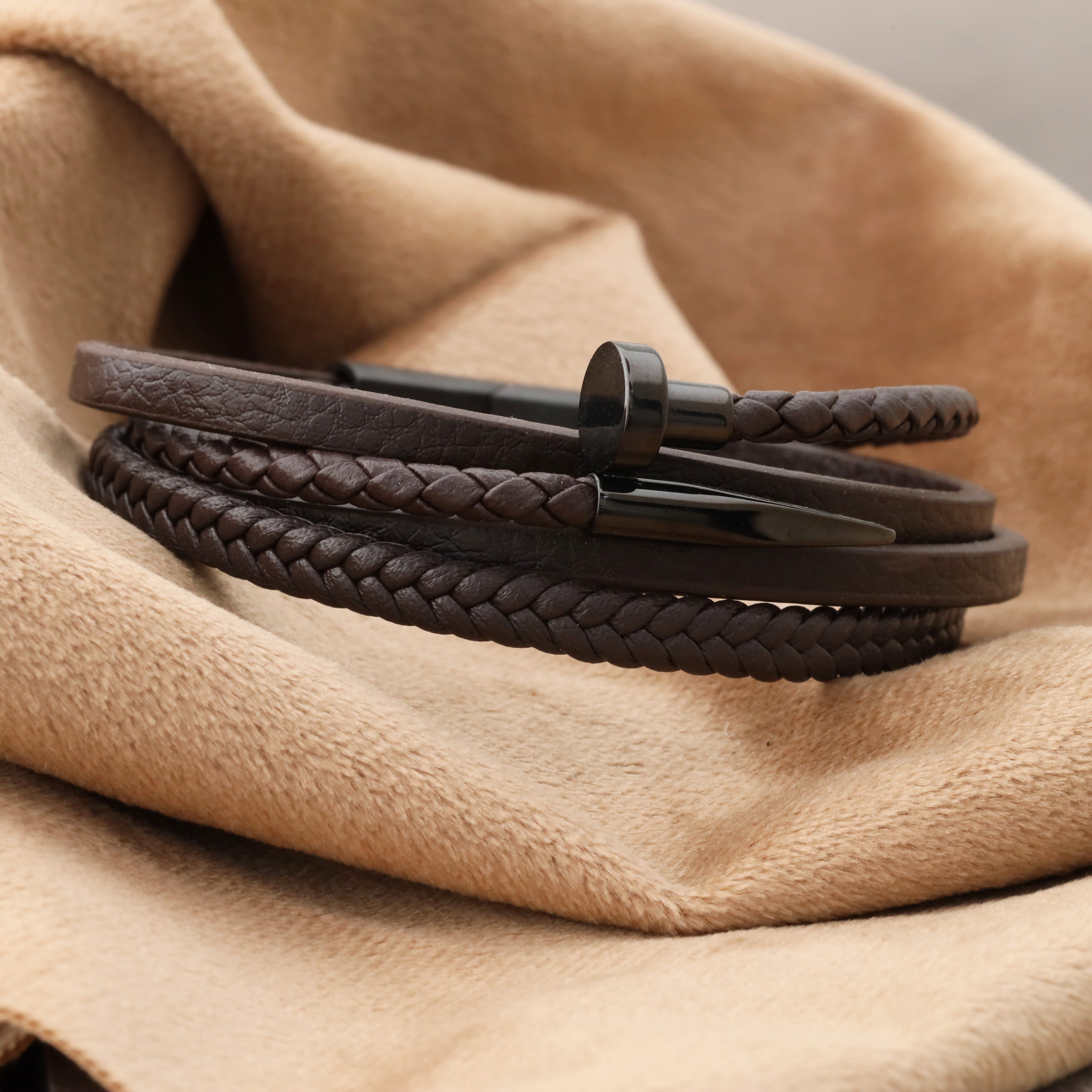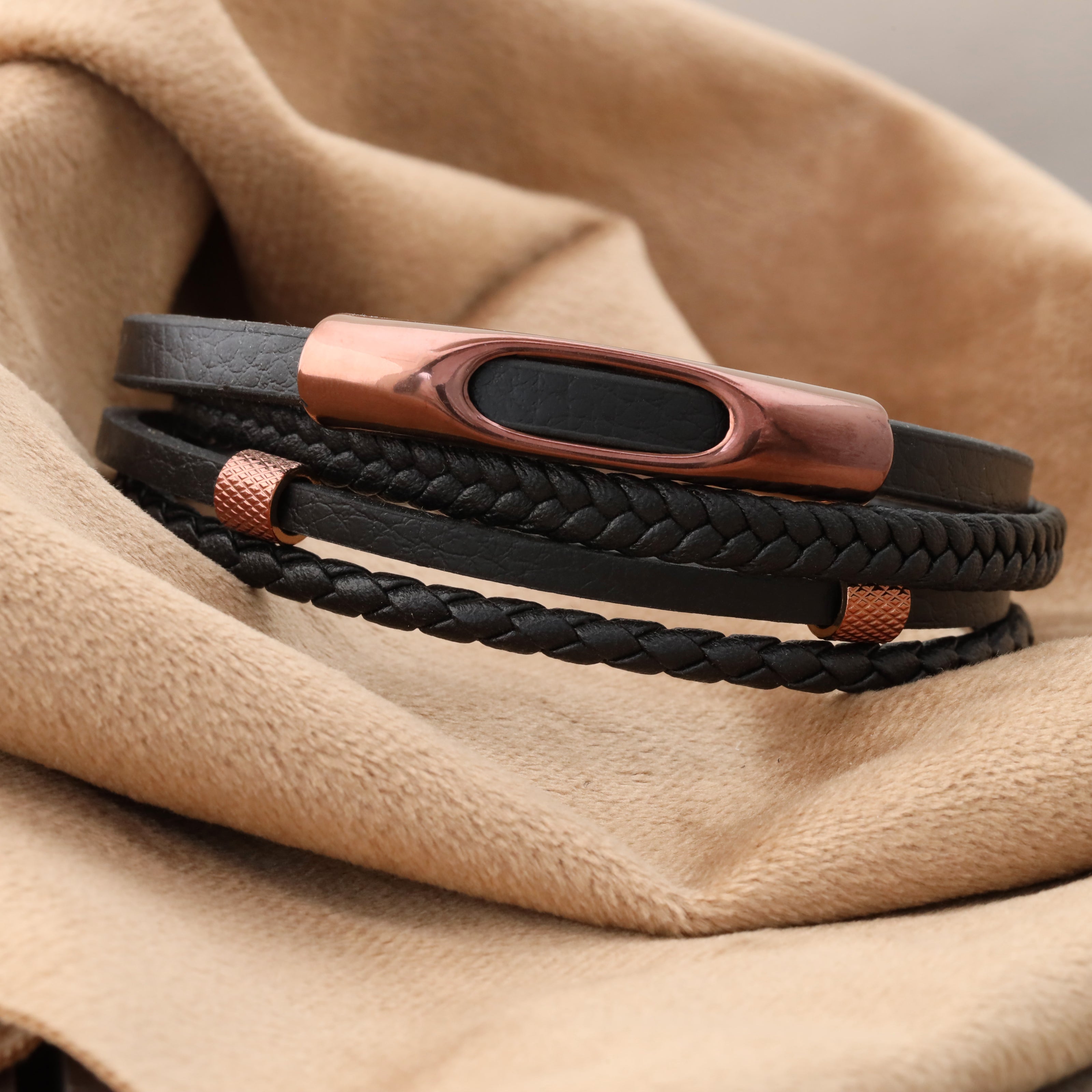 "Elegant Bear men's bracelet made of black braided leather with luxurious rose gold metal(L1120)