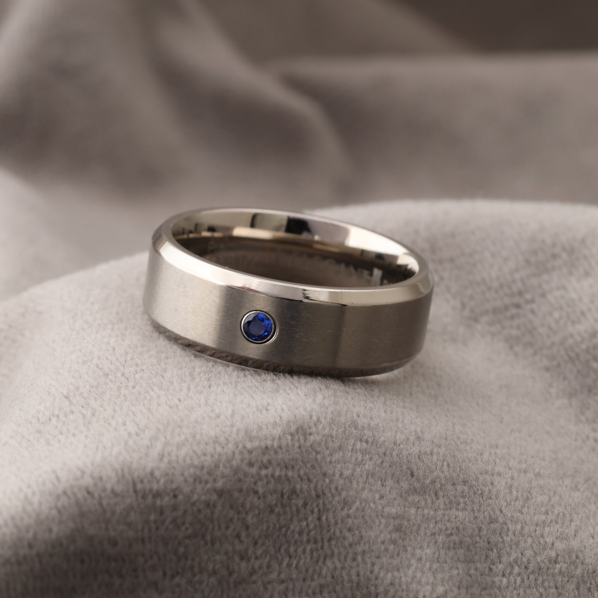 A334 Silver Titanium Ring with Blue Zircon - 8mm Width - Elegant Simplicity