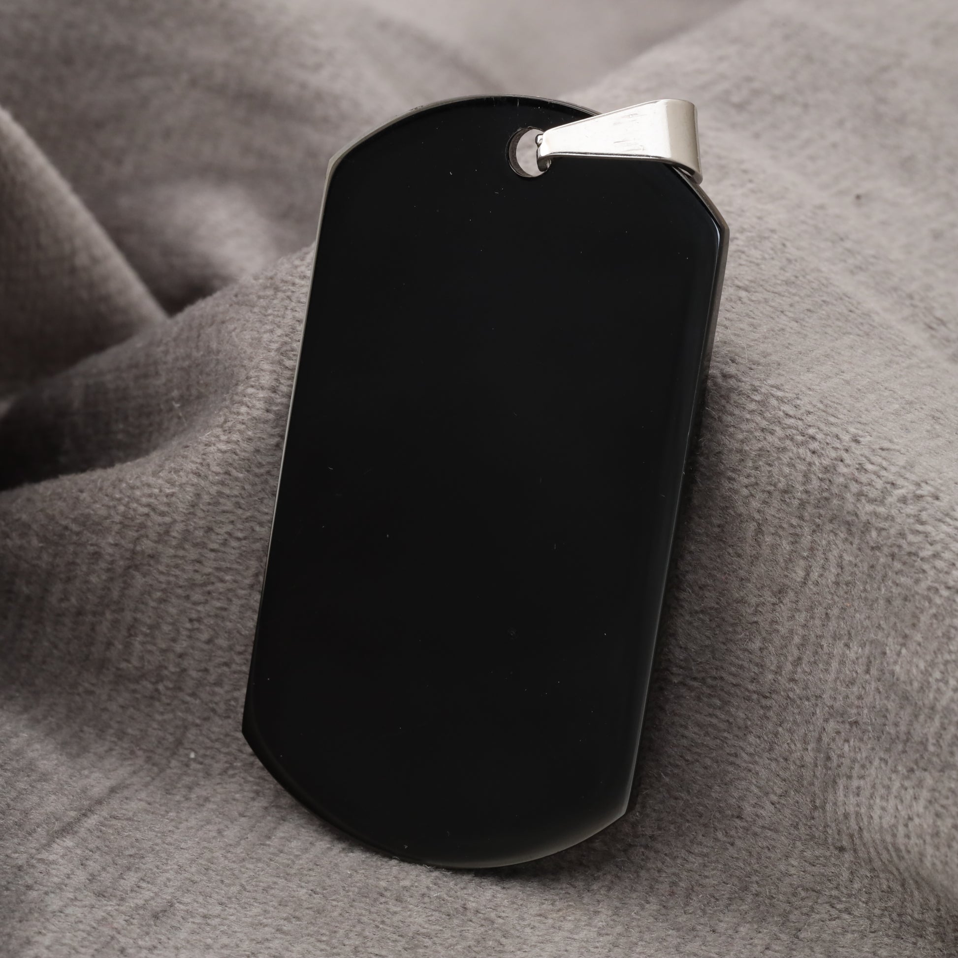 دلاية الهوية السوداء الفاخرة بتصميم أنيق وعصري يُظهر شكل بطاقة الهوية الكلاسيكية. تتميز بلون أسود عميق مع تشطيب مصقول ناعم، وسطح أملس يمكن نقش الأسماء أو الرسائل عليه، مما يجعلها قطعة مجوهرات شخصية ومميزة تناسب جميع الأذواق وتضفي لمسة من الأناقة العصرية.