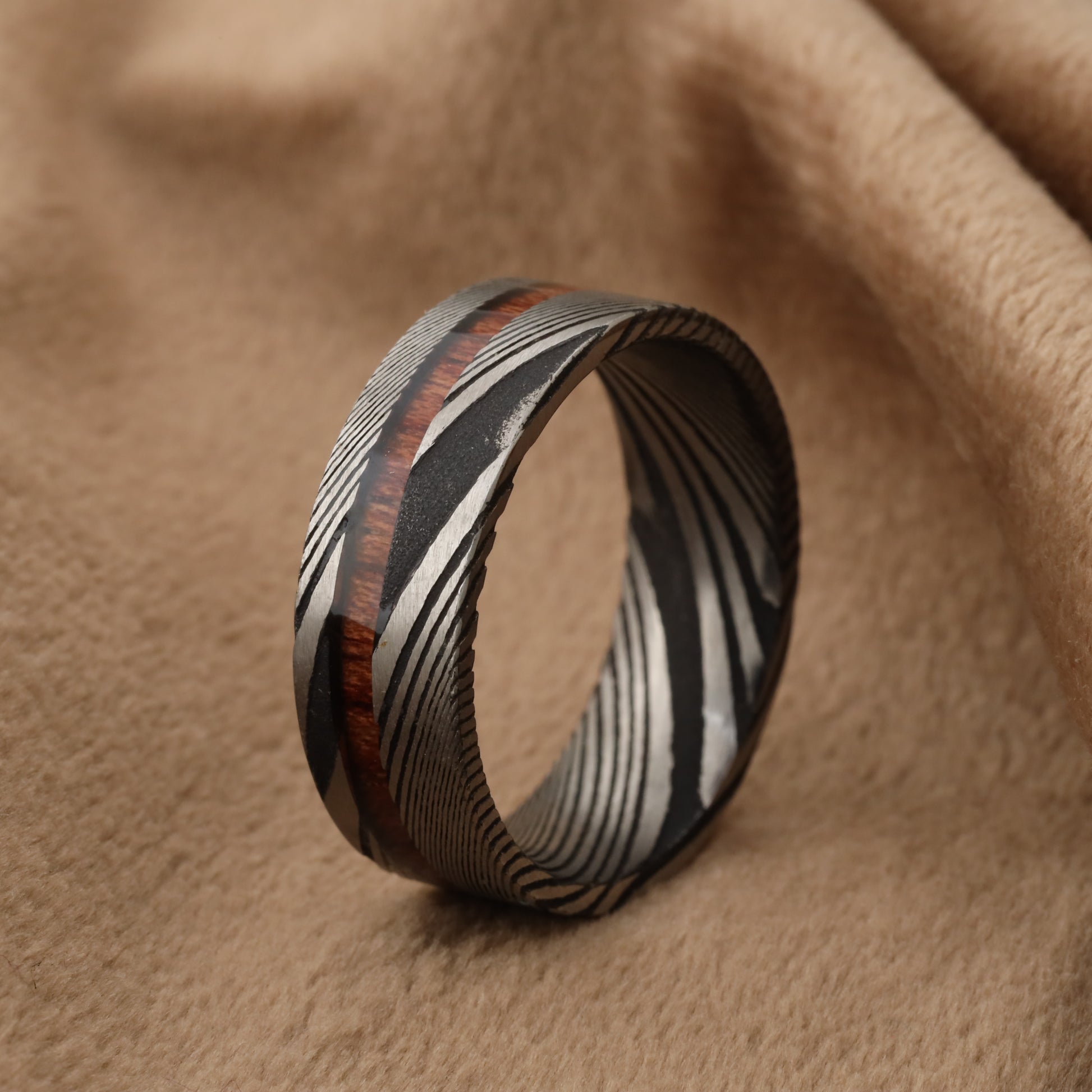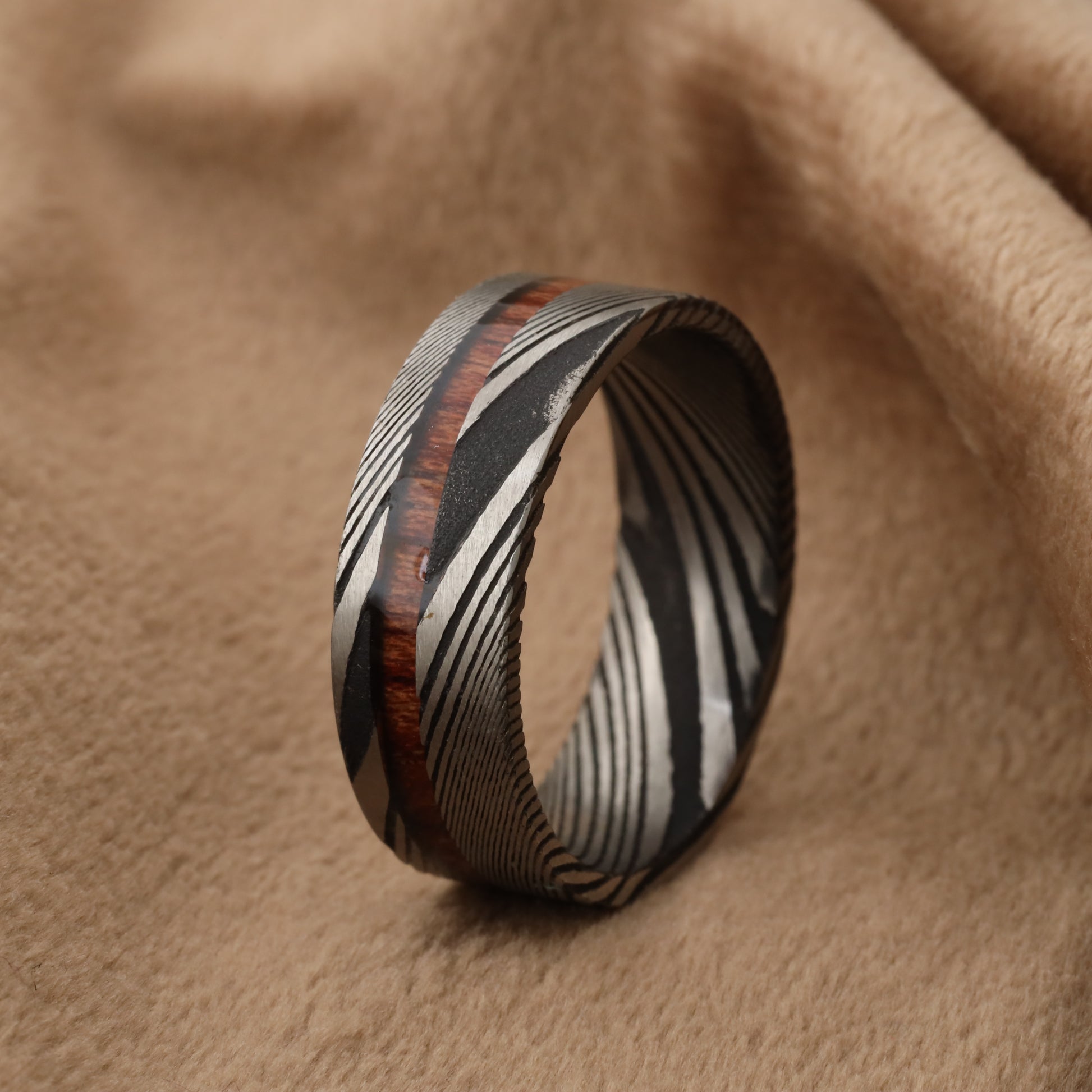 - Unique ring combining the strength of Damascus steel with the natural beauty of Koa wood