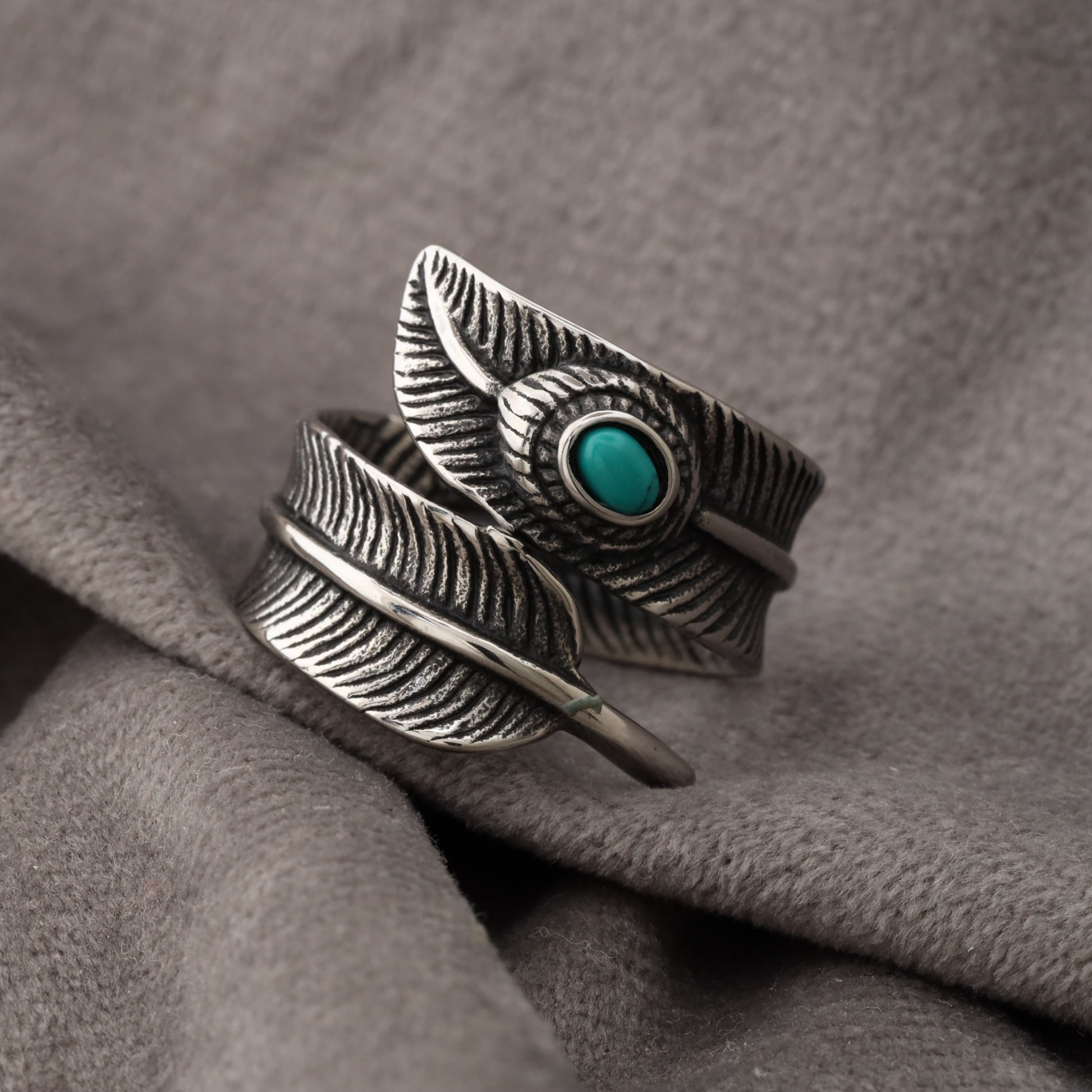 خاتم استثنائي مصنوع من الستانلس ستيل عالي الجودة، مصمم على شكل ريشة أنيقة تلتف حول الإصبع بطريقة فنية مبدعة. يتميز الخاتم بحجر الفيروز الطبيعي الجميل الذي يضفي لمسة من الألوان الزاهية والطاقة الإيجابية.