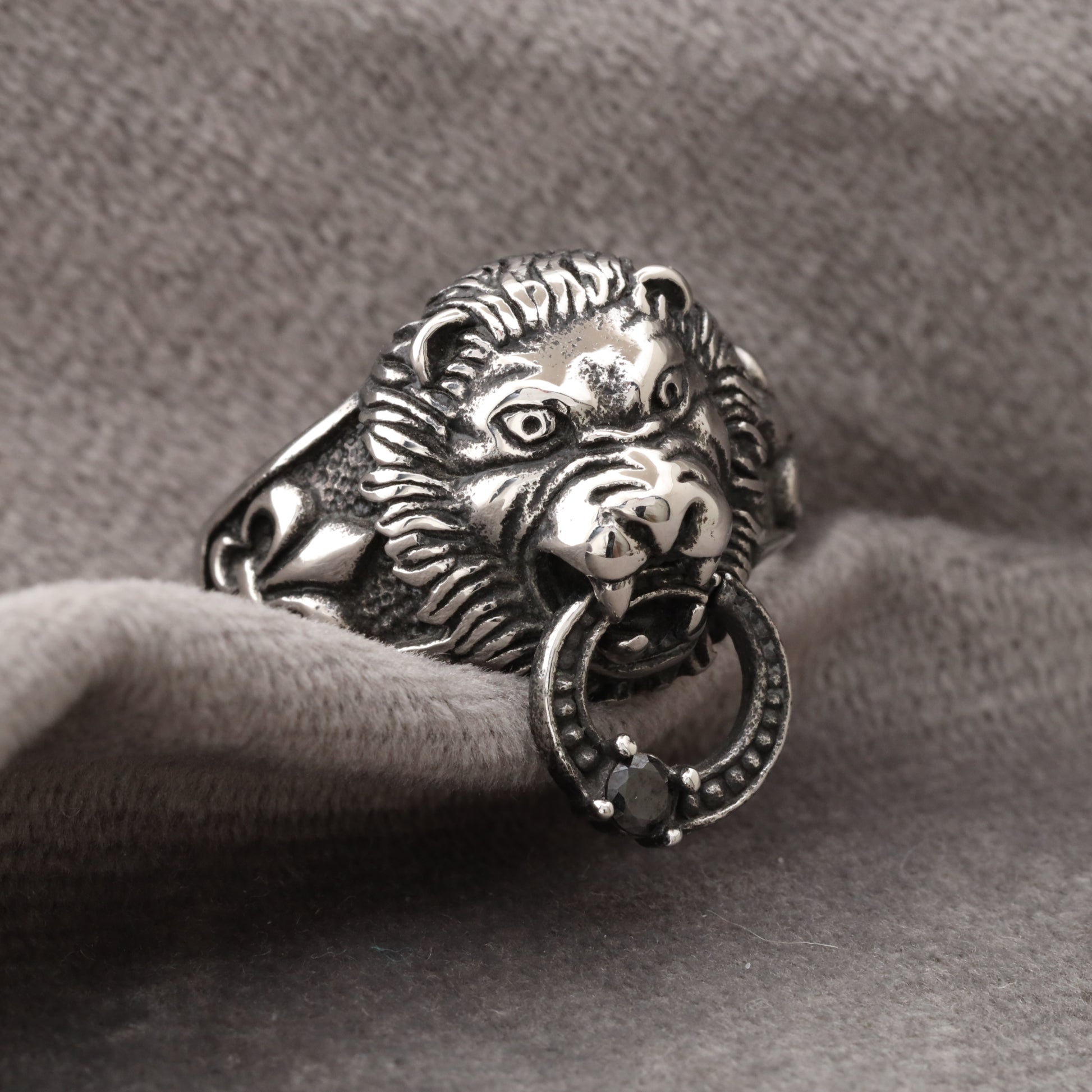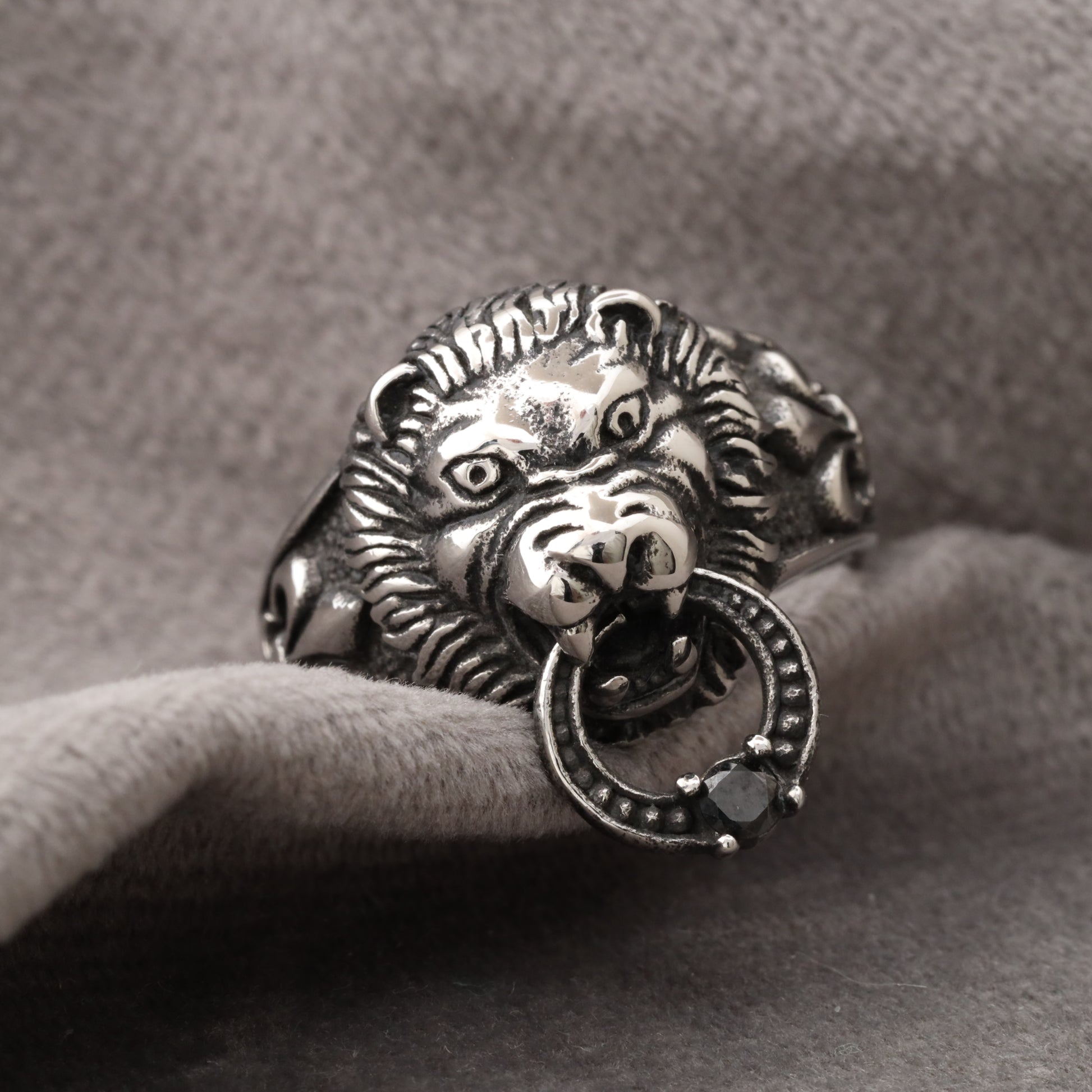 خاتم استثنائي مصنوع من الستانلس ستيل عالي الجودة، مصمم على شكل رأس أسد مهيب بتفاصيل دقيقة ومذهلة. يتميز الخاتم بحجر أسود طبيعي أنيق يتدلى من فم الأسد، مما يضفي لمسة من الغموض والفخامة على التصميم الملكي.