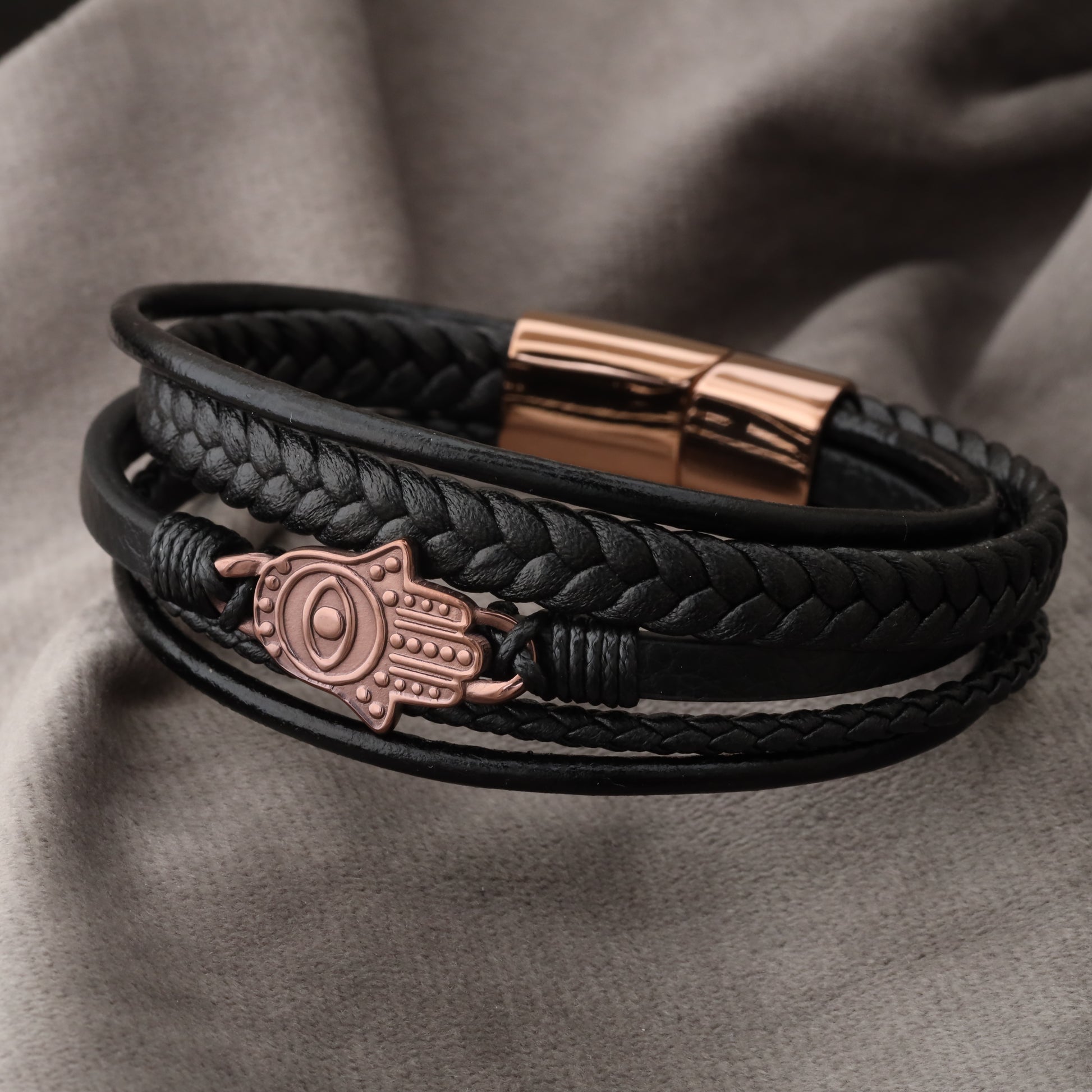 Hamsa Design Black Genuine Leather Brown Stainless Steel Bracelet L1140