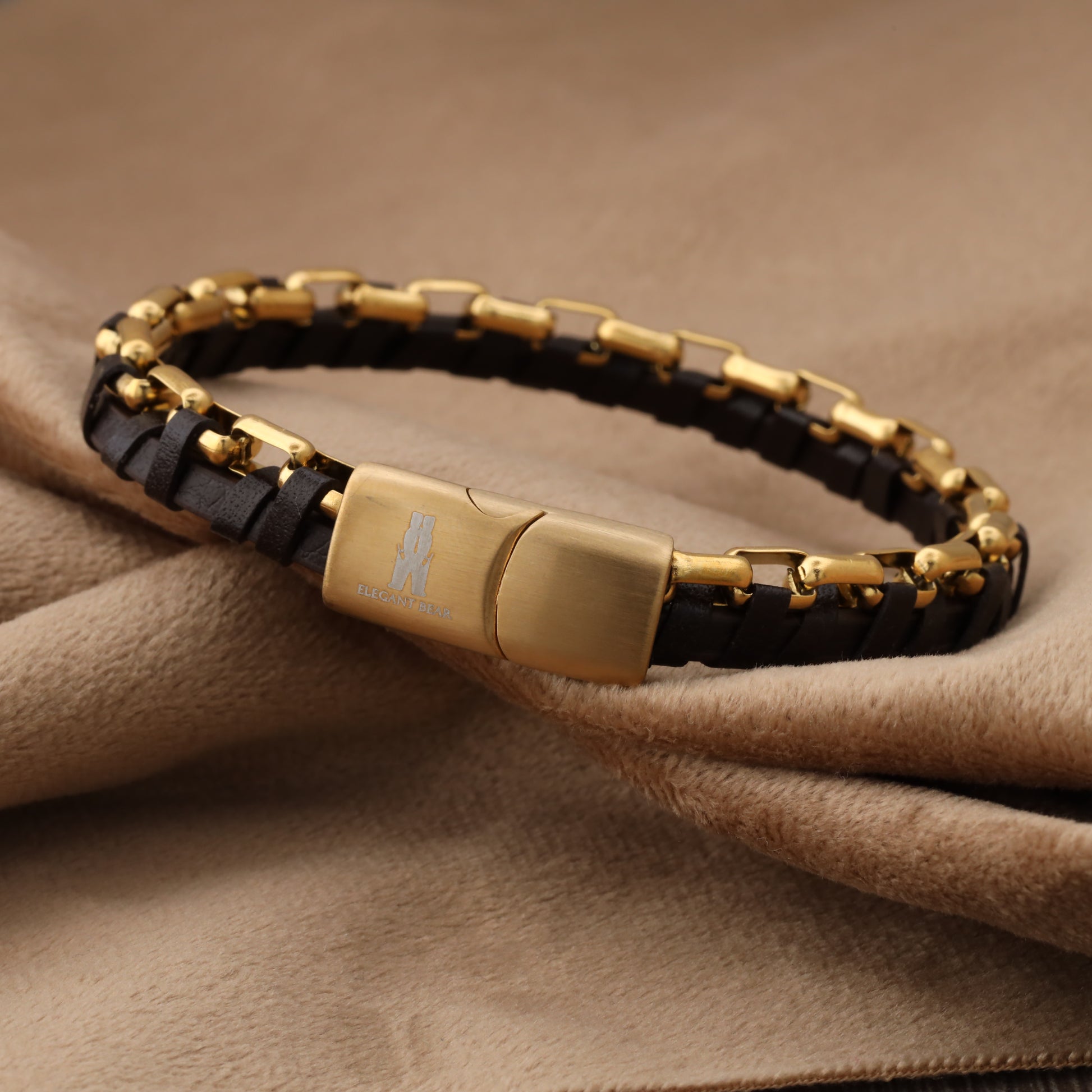 يرمز هذا السوار إلى القوة والأناقة، حيث يجمع بين صلابة المعدن ونعومة الجلد الطبيعي، ليعكس شخصية متوازنة تجمع بين الحزم والرقي.