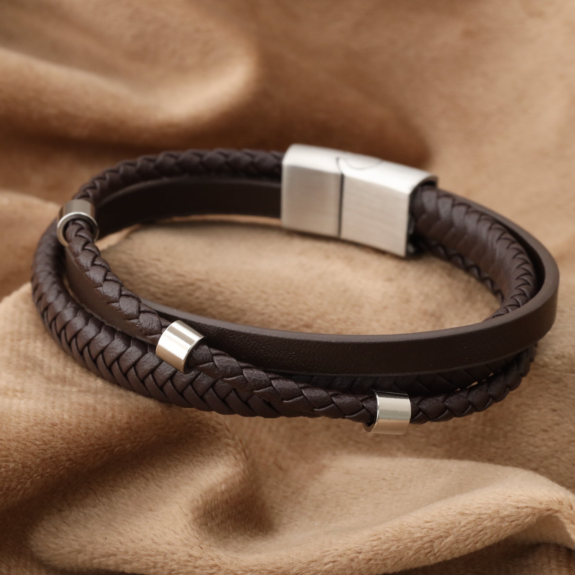 أسورة فاخرة تجمع بين دفء الجلد الطبيعي البني الأنيق ومتانة الستانلس ستيل عالي الجودة. تصميم عصري يناسب الإطلالات اليومية والمناسبات الخاصة، مصنوعة بعناية فائقة لتمنحك مظهراً مميزاً وأنيقاً.