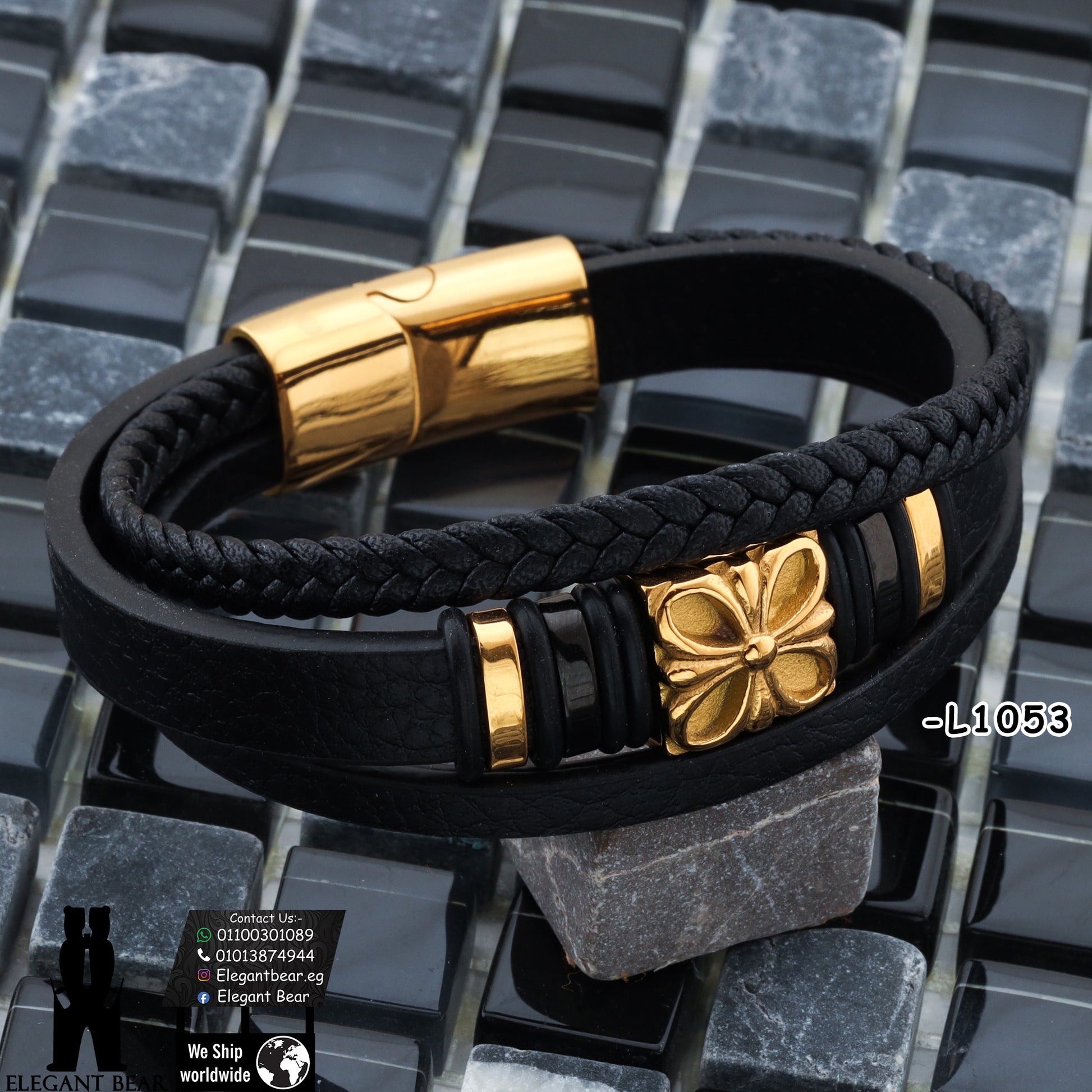 سوار أنيق مصنوع من الجلد الطبيعي متعدد الطبقات باللون الأسود عالي الجودة. يتميز بزهرة ذهبية مركزية محفورة بتفاصيل دقيقة وقفل مغناطيسي ذهبي اللون يضفي لمسة من الفخامة والأناقة الطبيعية المميزة.