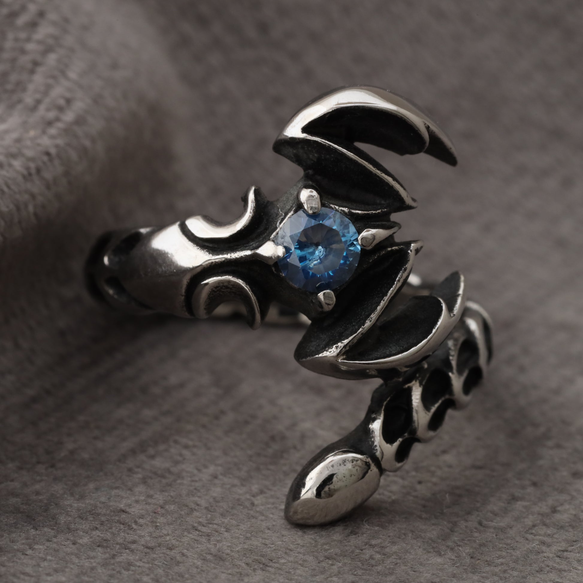 خاتم فريد من نوعه يجمع بين قوة العقرب وأناقة الفولاذ المقاوم للصدأ. يتميز بتصميم معقد يُظهر عقرباً ملتفاً حول حجر أزرق لامع، مما يخلق قطعة مجوهرات استثنائية تلفت الأنظار.