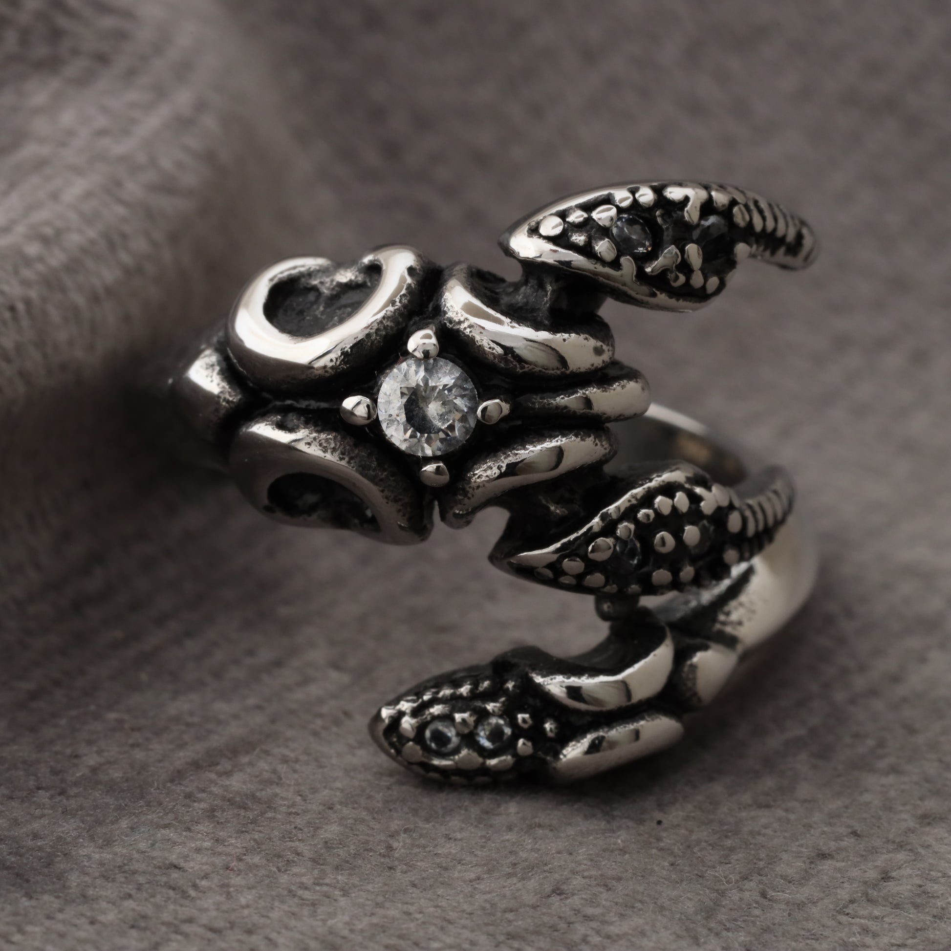 خاتم فريد من نوعه يجمع بين قوة العقرب وأناقة الفولاذ المقاوم للصدأ. يتميز بتصميم معقد يُظهر عقرباً ملتفاً حول حجر أبيض لامع، مما يخلق قطعة مجوهرات استثنائية تلفت الأنظار.