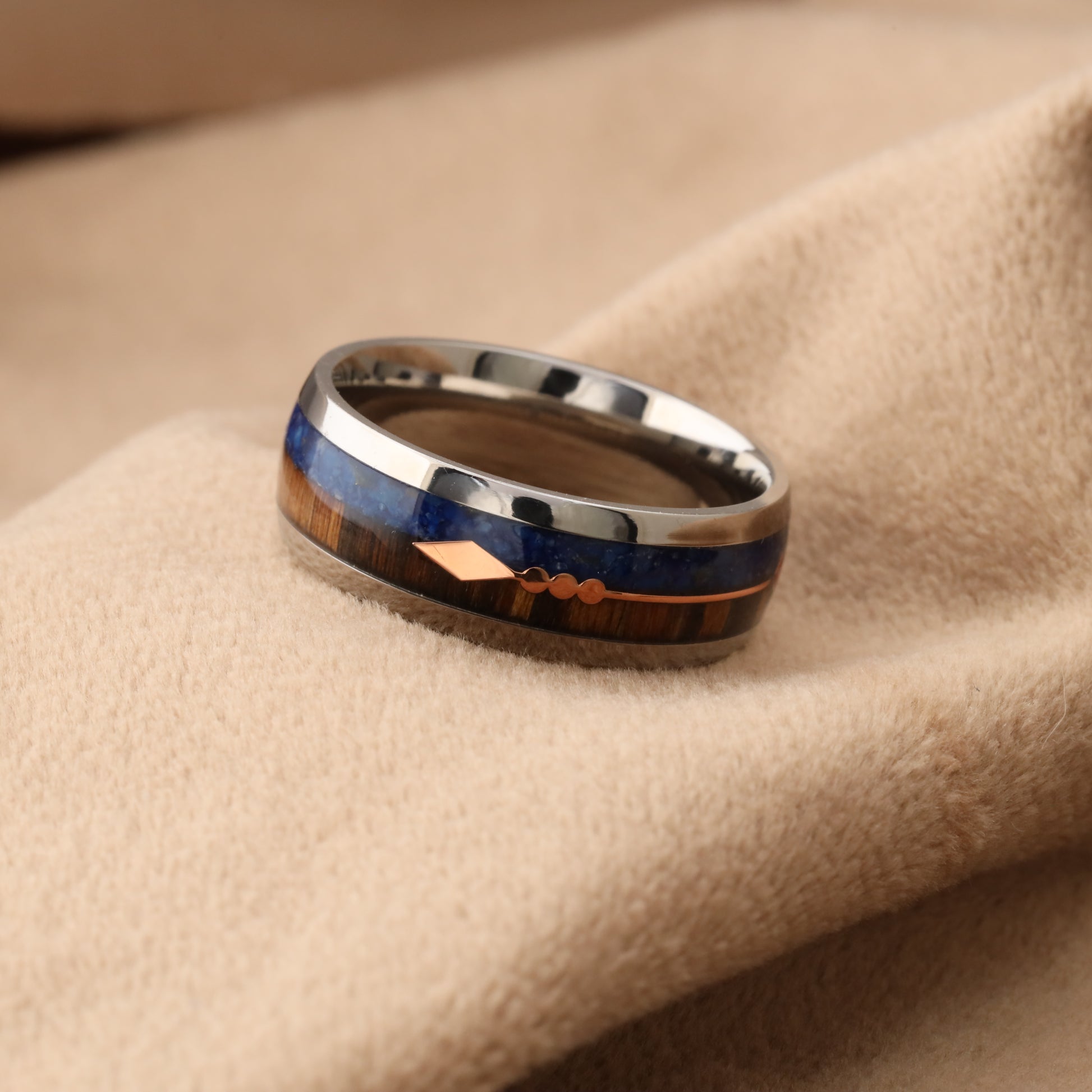 Silver Titanium Ring with Lapis Lazuli & Zebra Wood - Rose Gold Arrow - 8mm - A177
