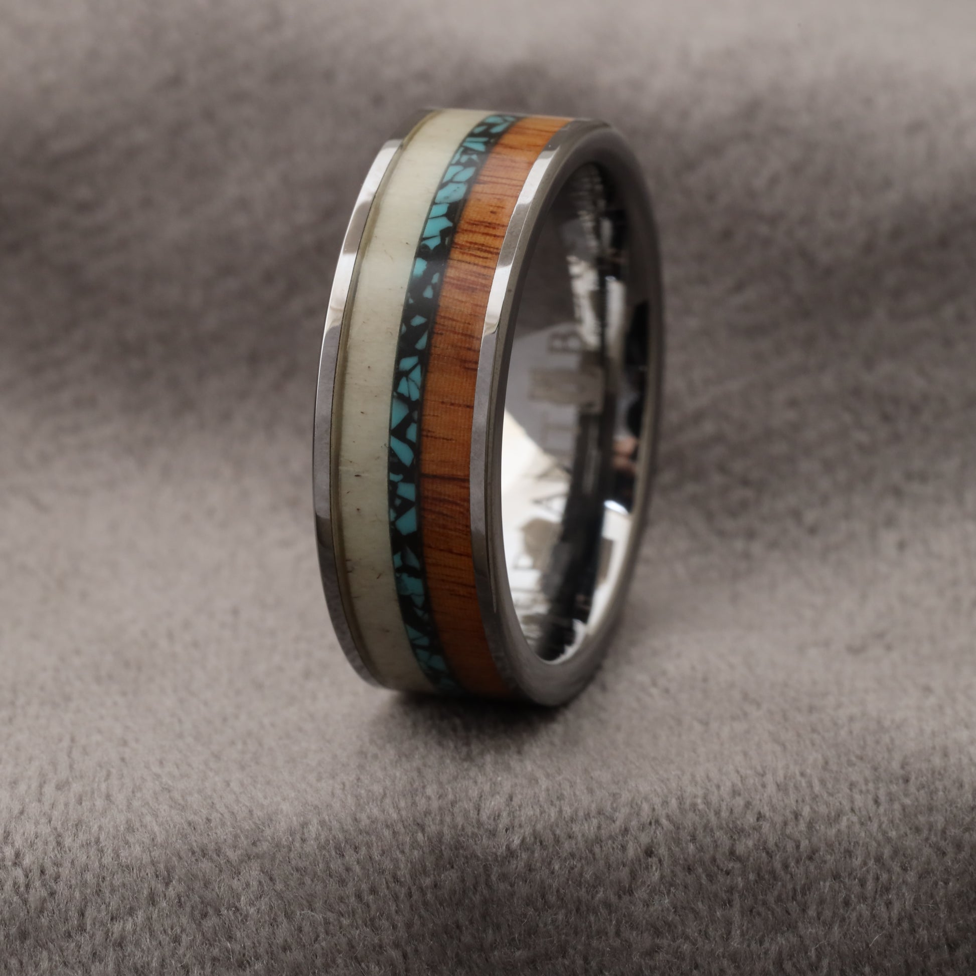 Silver Tungsten Ring with Deer Antler, Crushed Turquoise & Koa Wood - Triple Inlay - 8mm - A169
