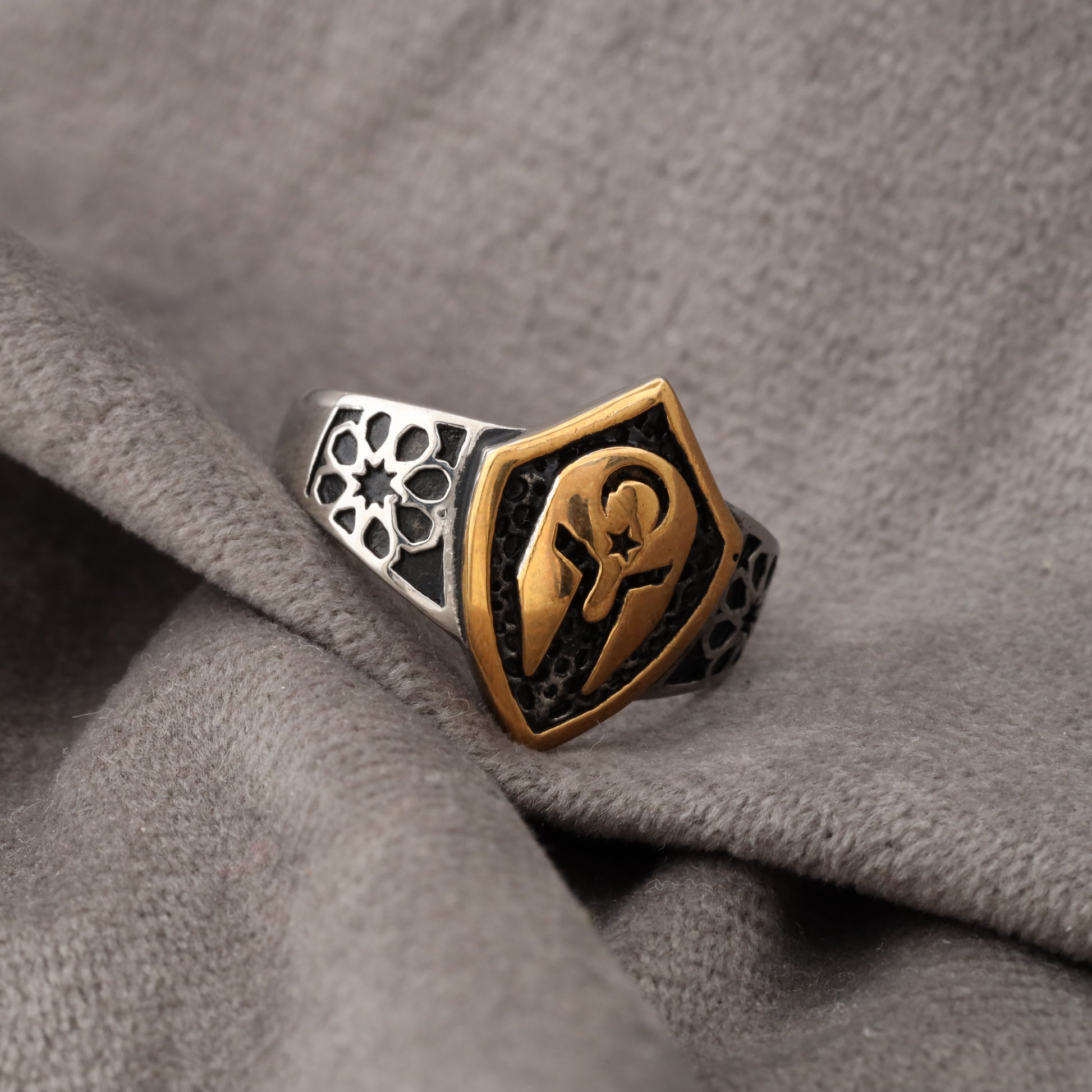 An elegant ring crafted from high-quality stainless steel, featuring a unique and distinctive design with prominent metal details and partial gold plating. Modern and bold design that catches attention and adds a touch of luxury and elegance to your look.