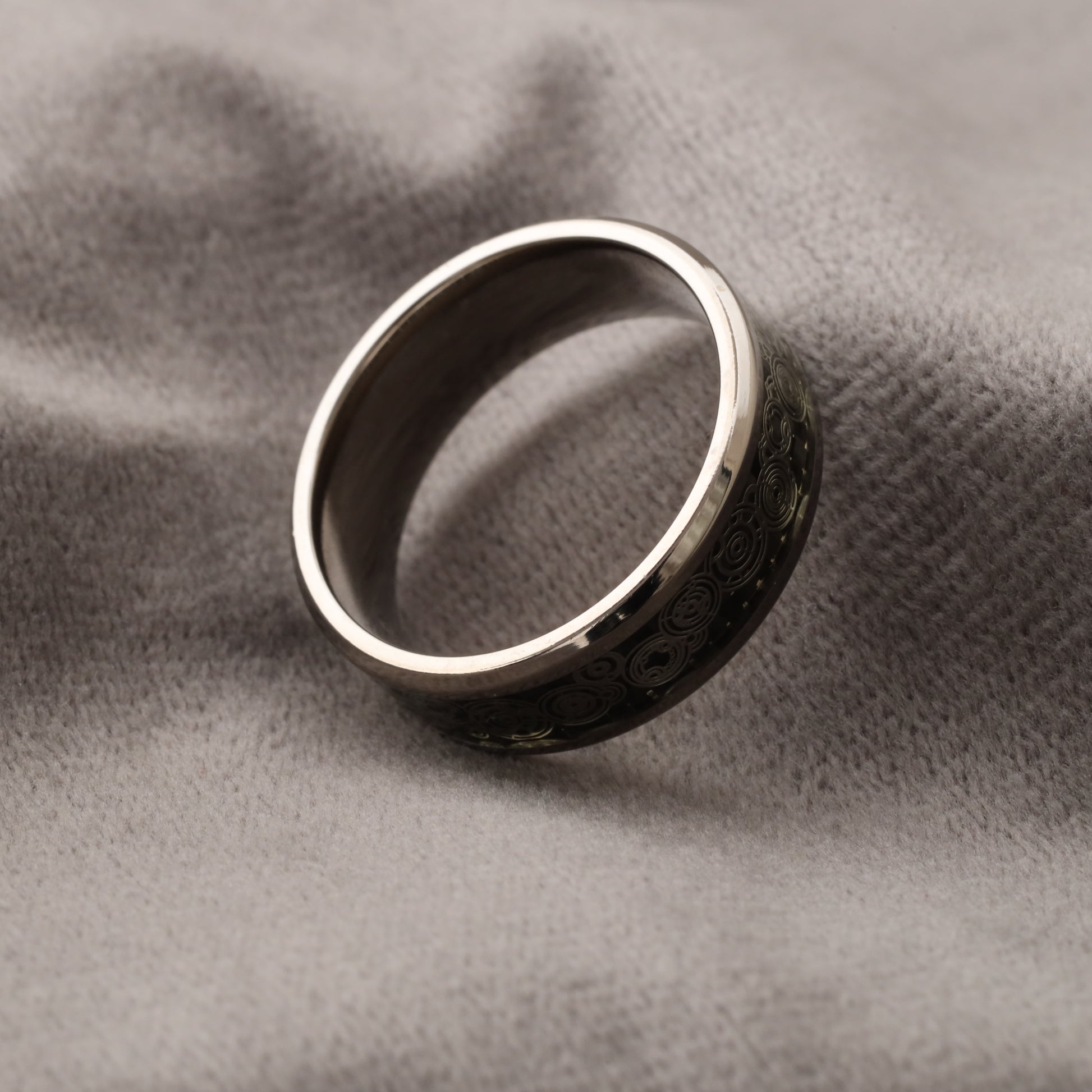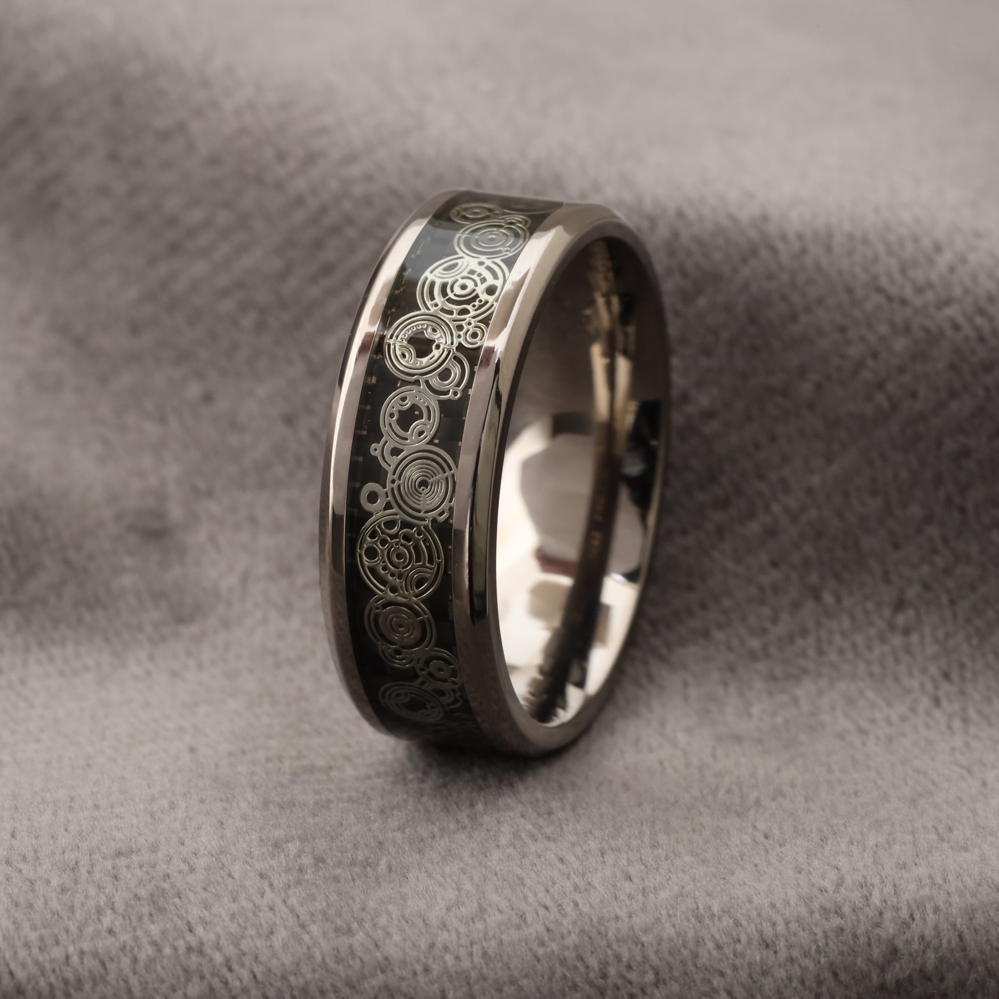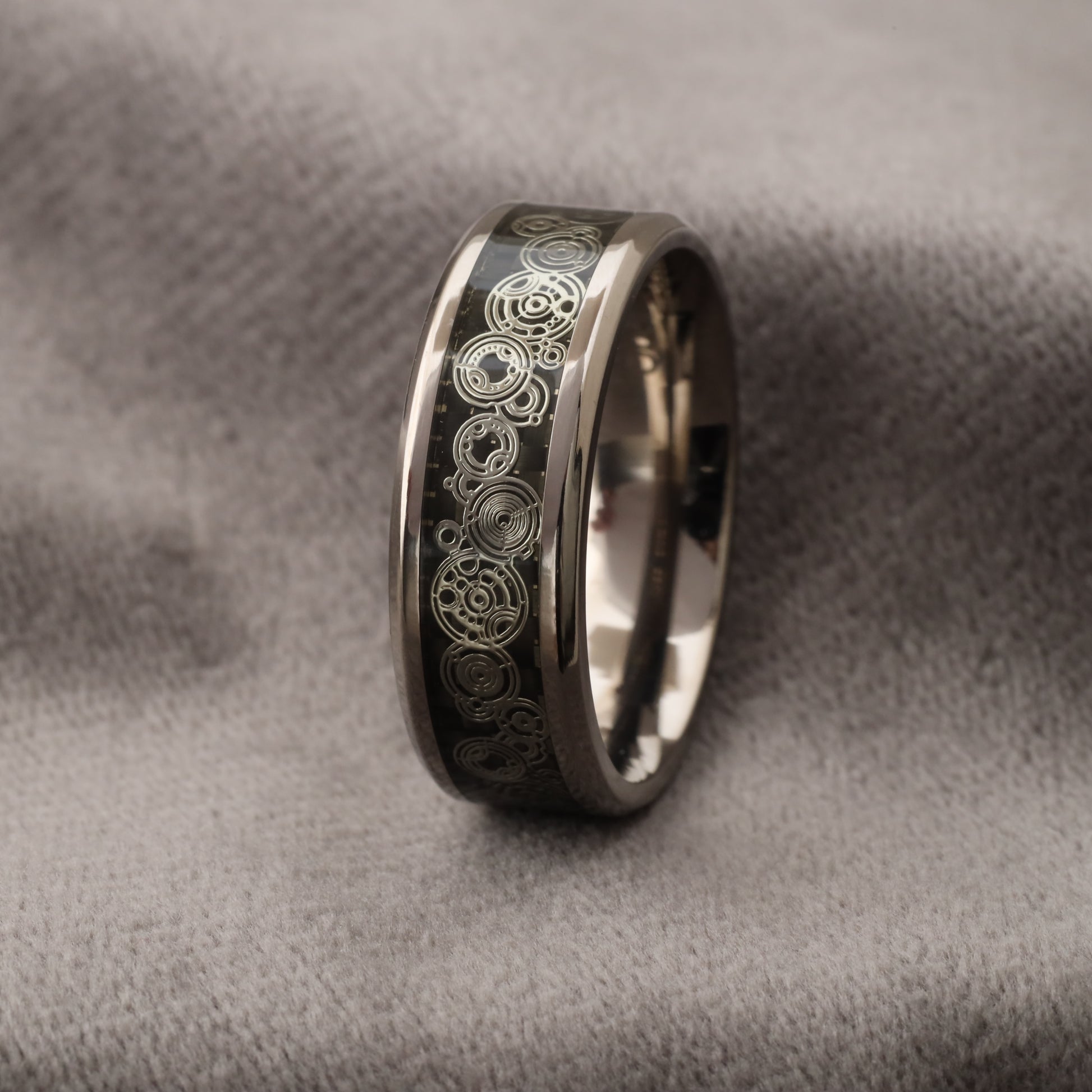 A premium silver titanium ring with an 8mm width, featuring a unique Steampunk design with intricate concentric circles in the center, inlaid with black carbon fiber that adds a modern and bold touch.