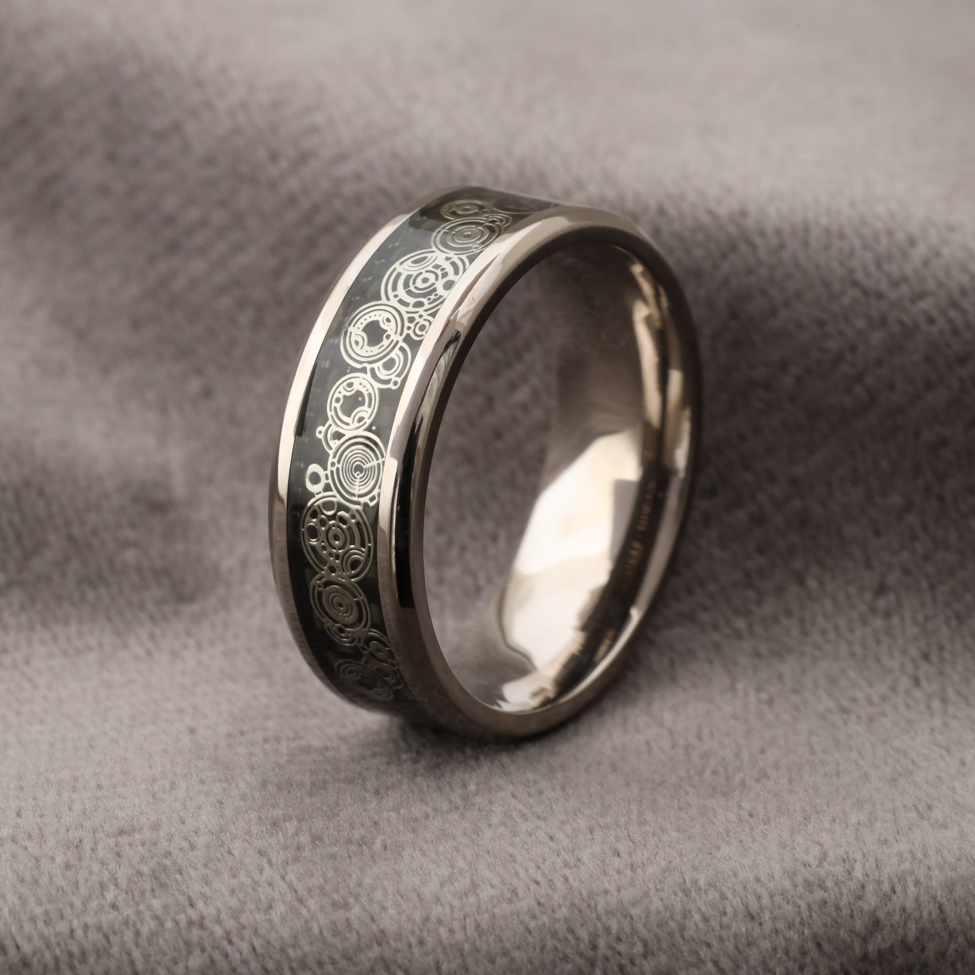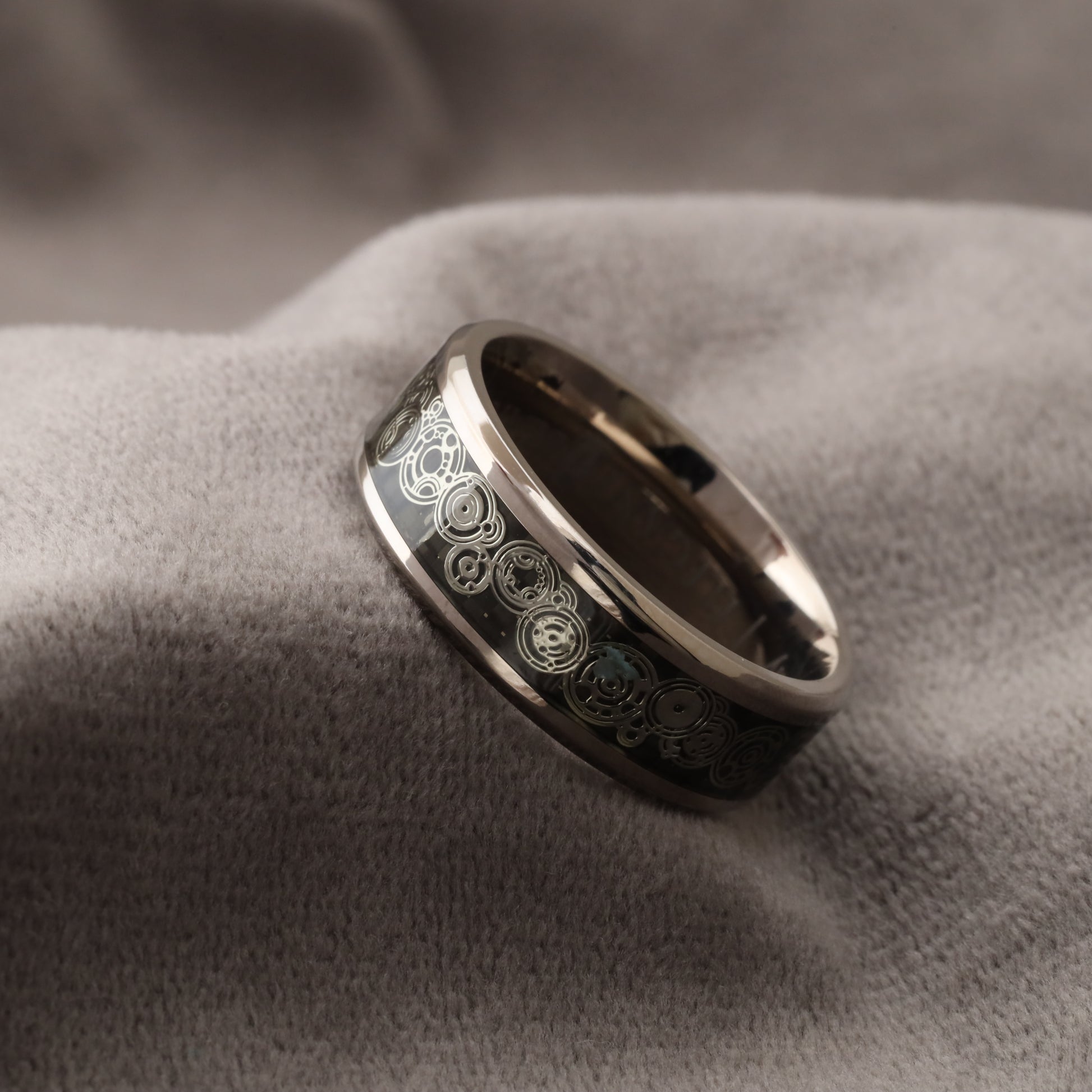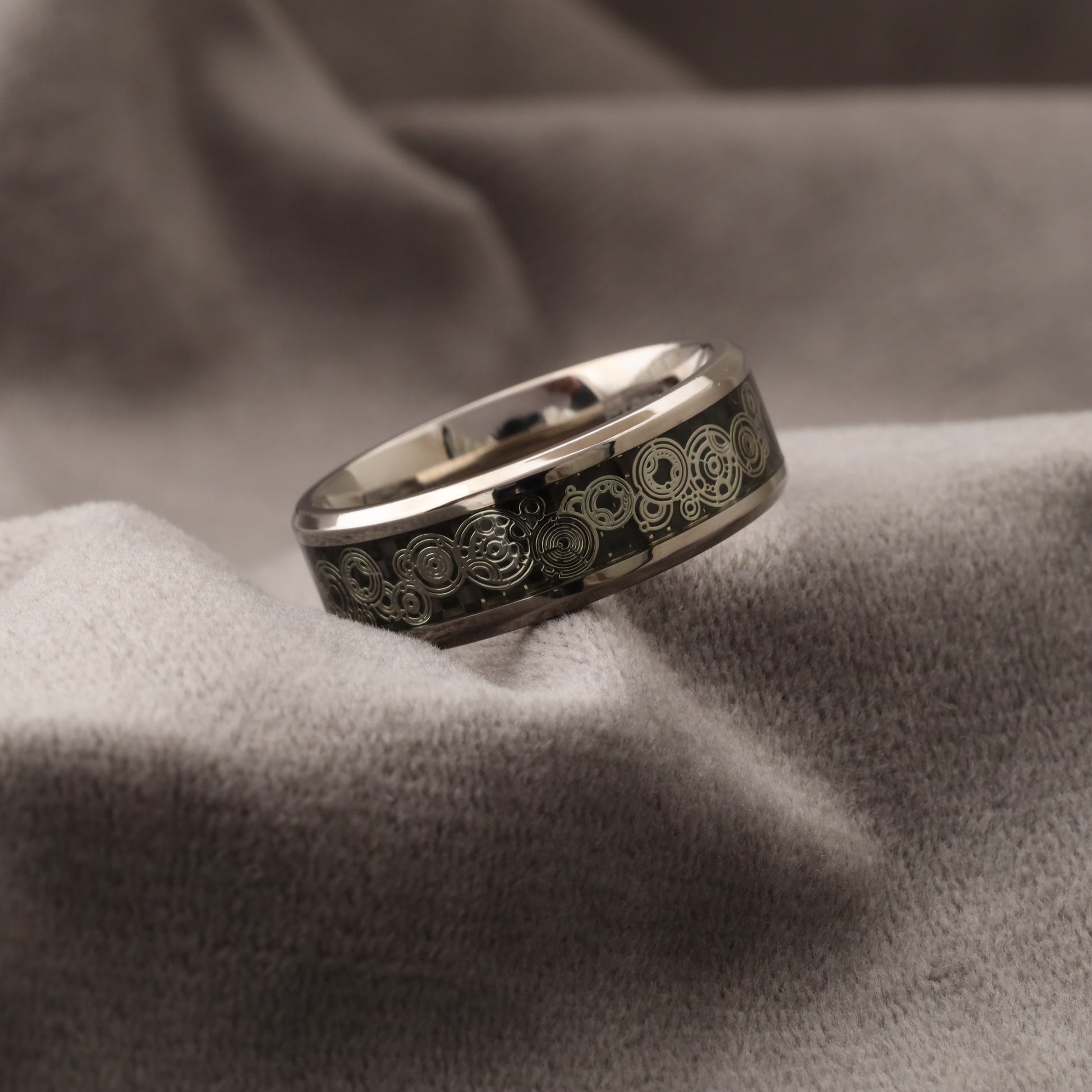 A premium silver titanium ring with an 8mm width, featuring a unique Steampunk design with intricate concentric circles in the center, inlaid with black carbon fiber that adds a modern and bold touch.