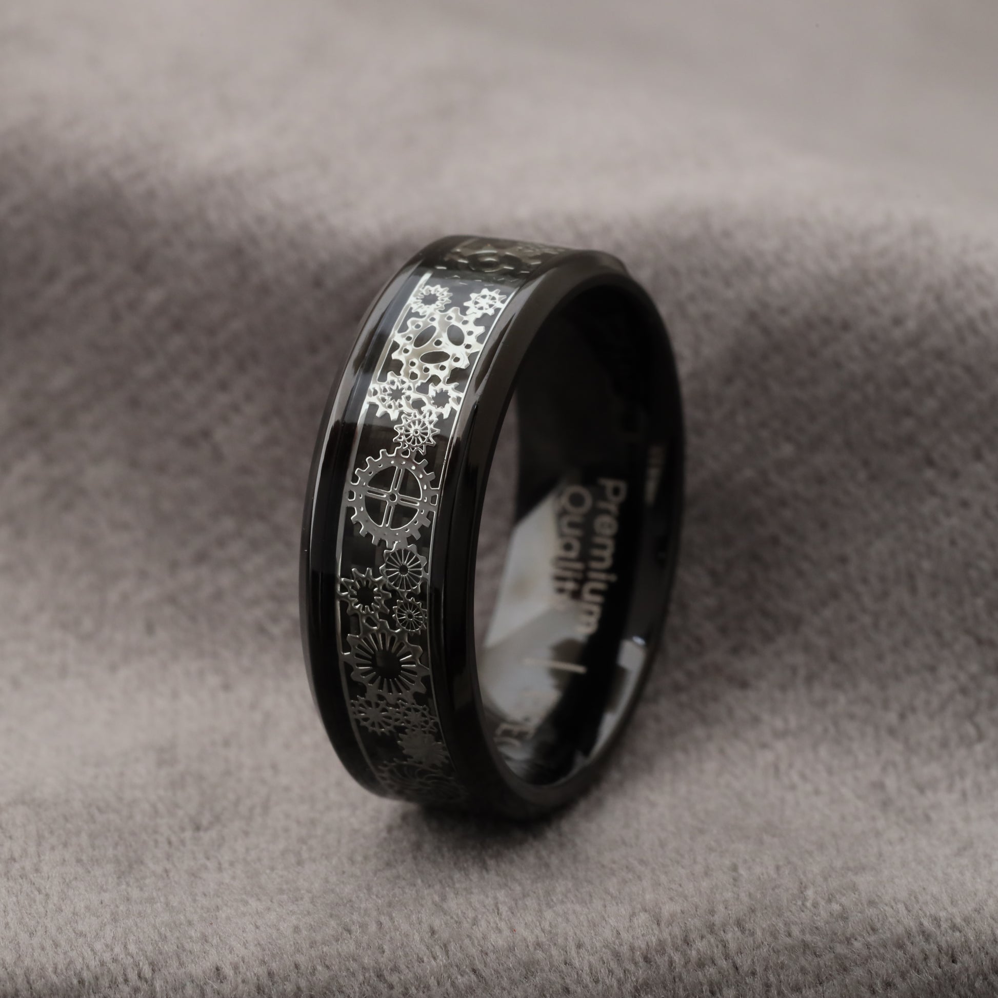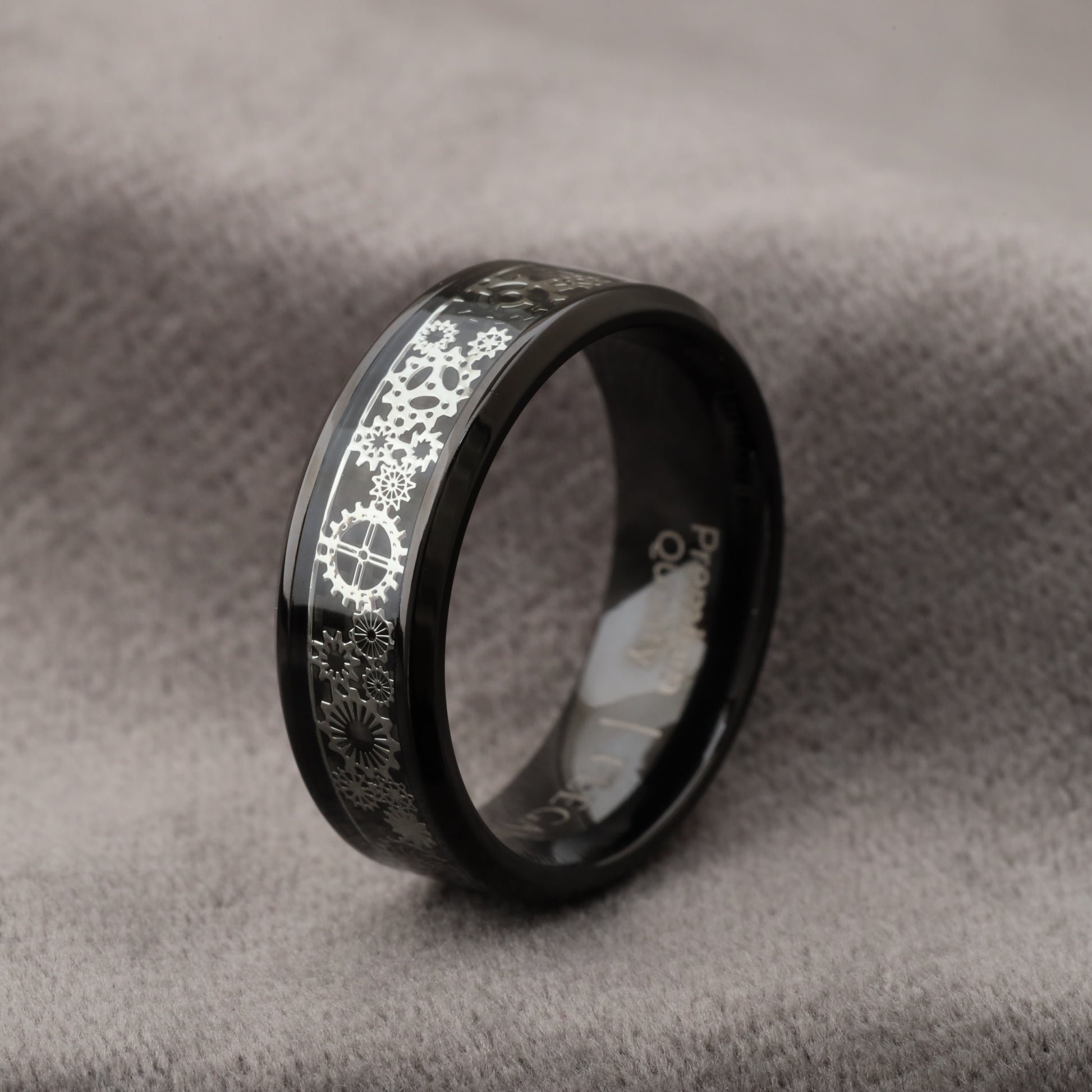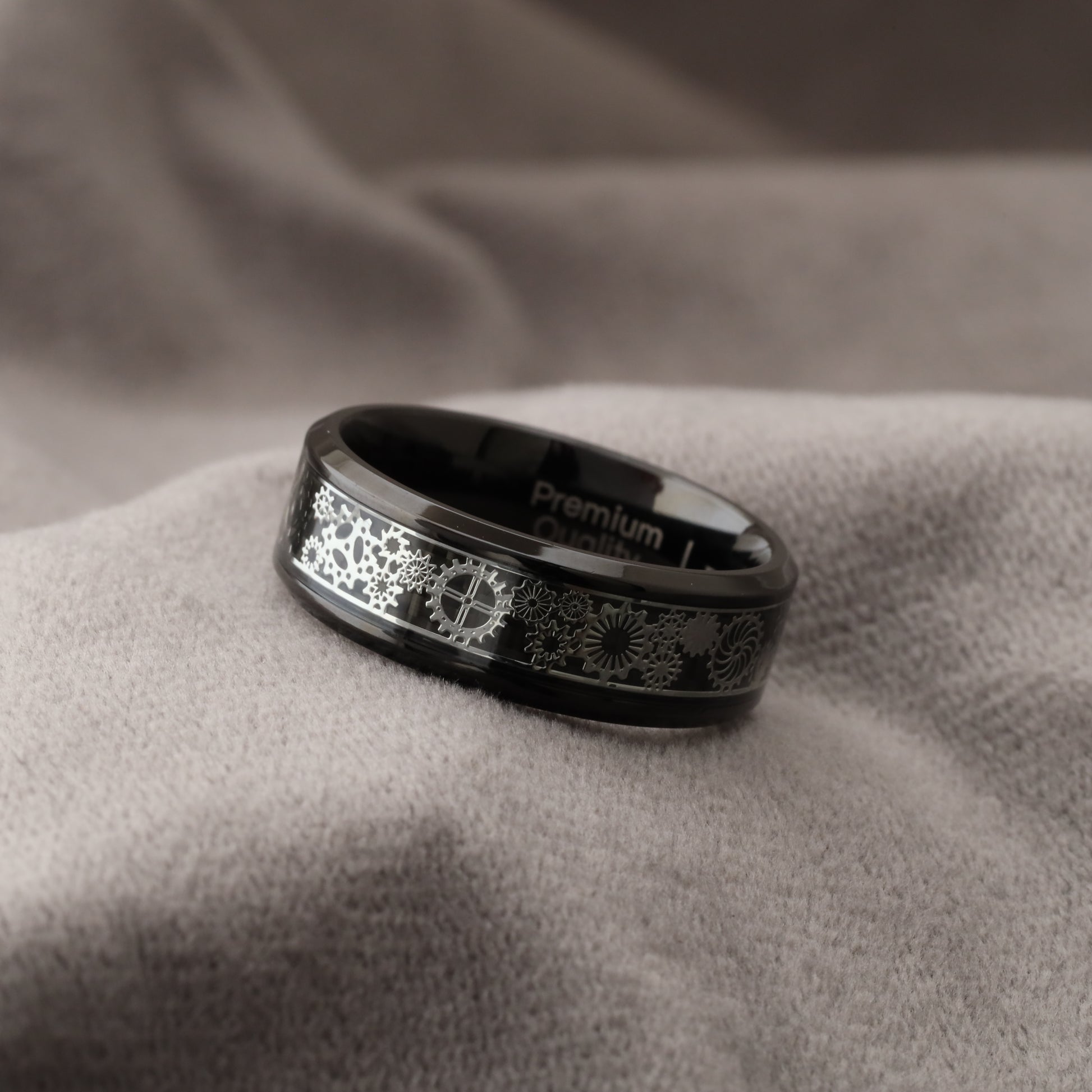 Titanium & Black Carbon Fiber Ring with Silver Gears - Industrial Design - 8mm - A332