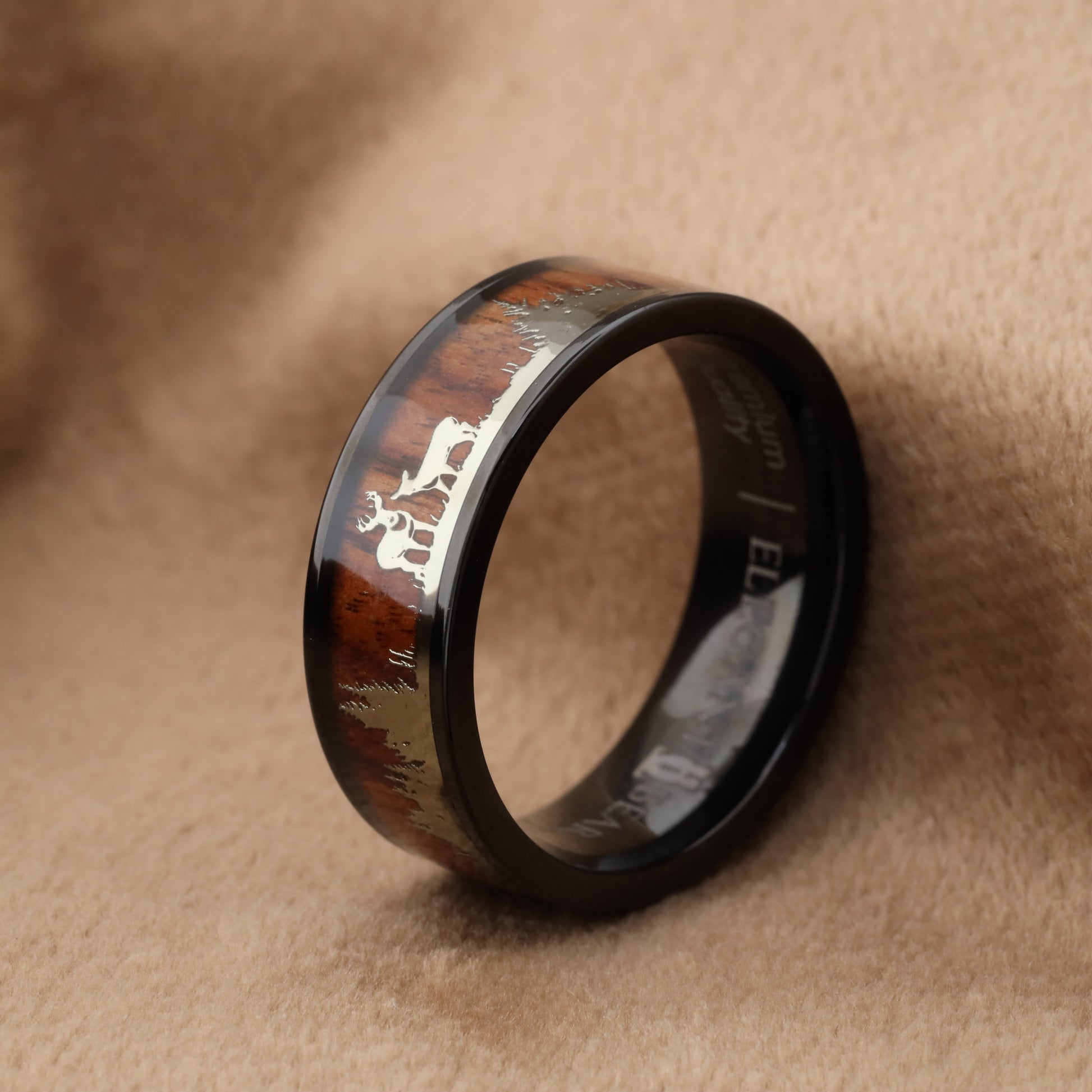 دبلة فاخرة من التيتانيوم مطعمة بخشب الكوا الهاوايي مع نقش استانلس ستيل للغابة والغزلان من الداخل