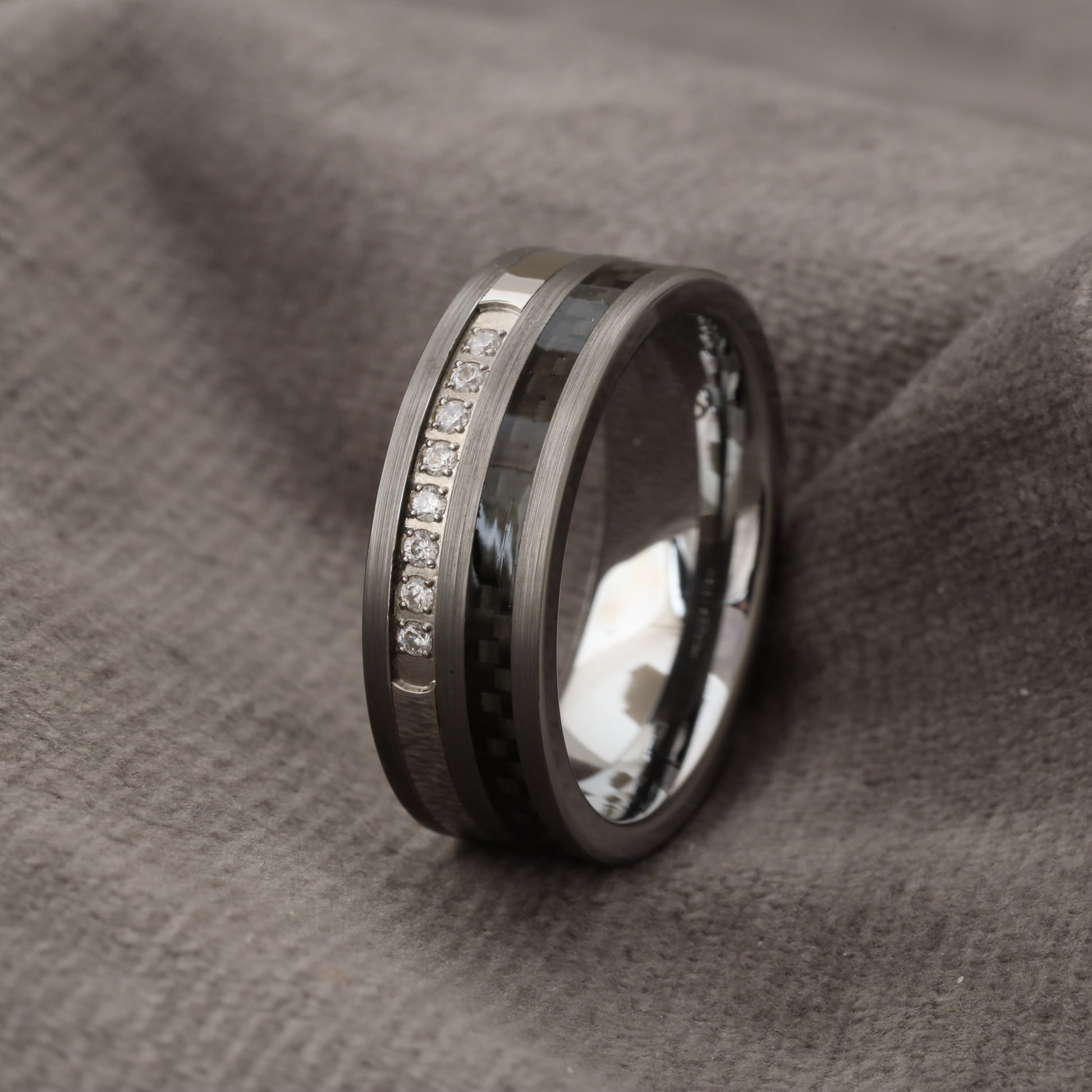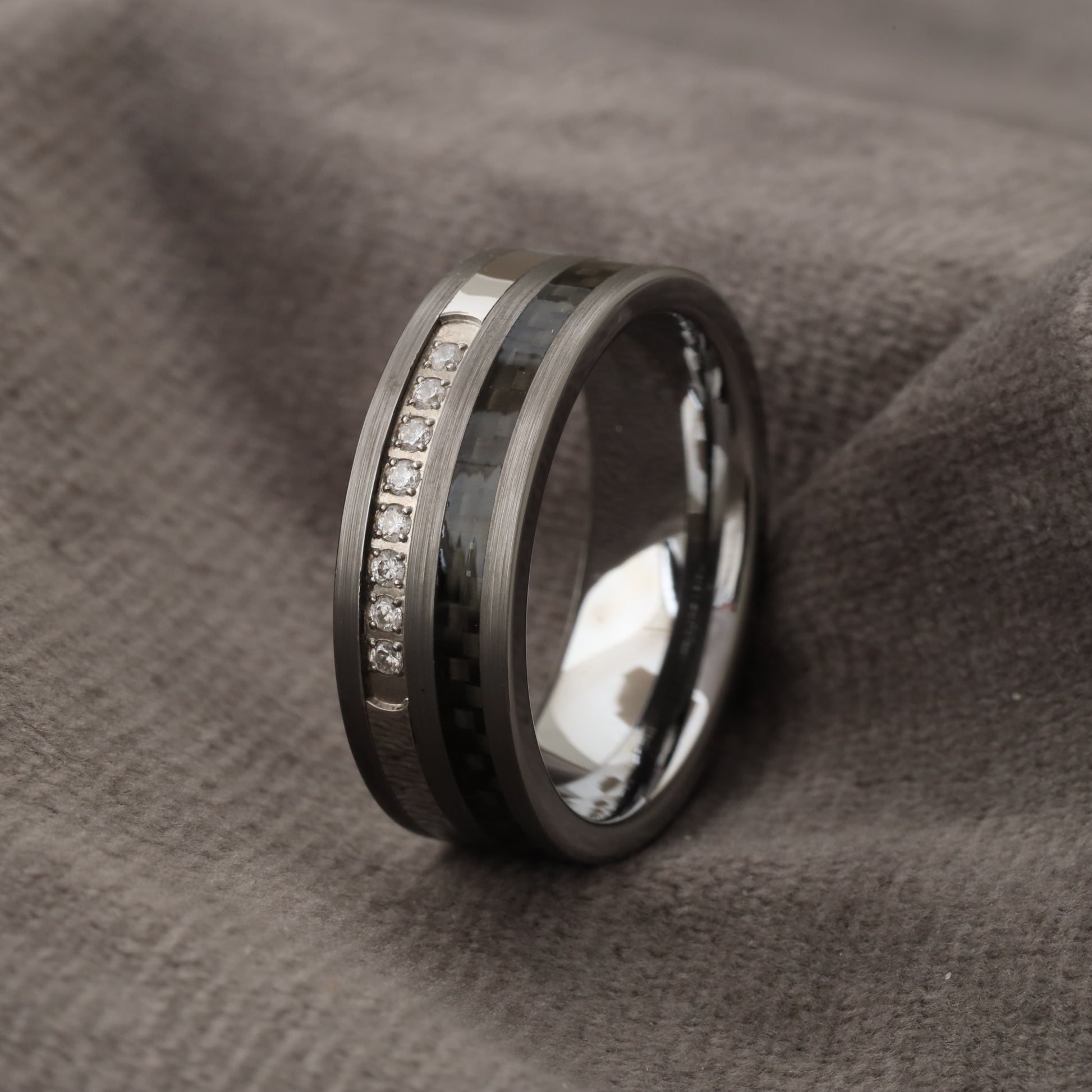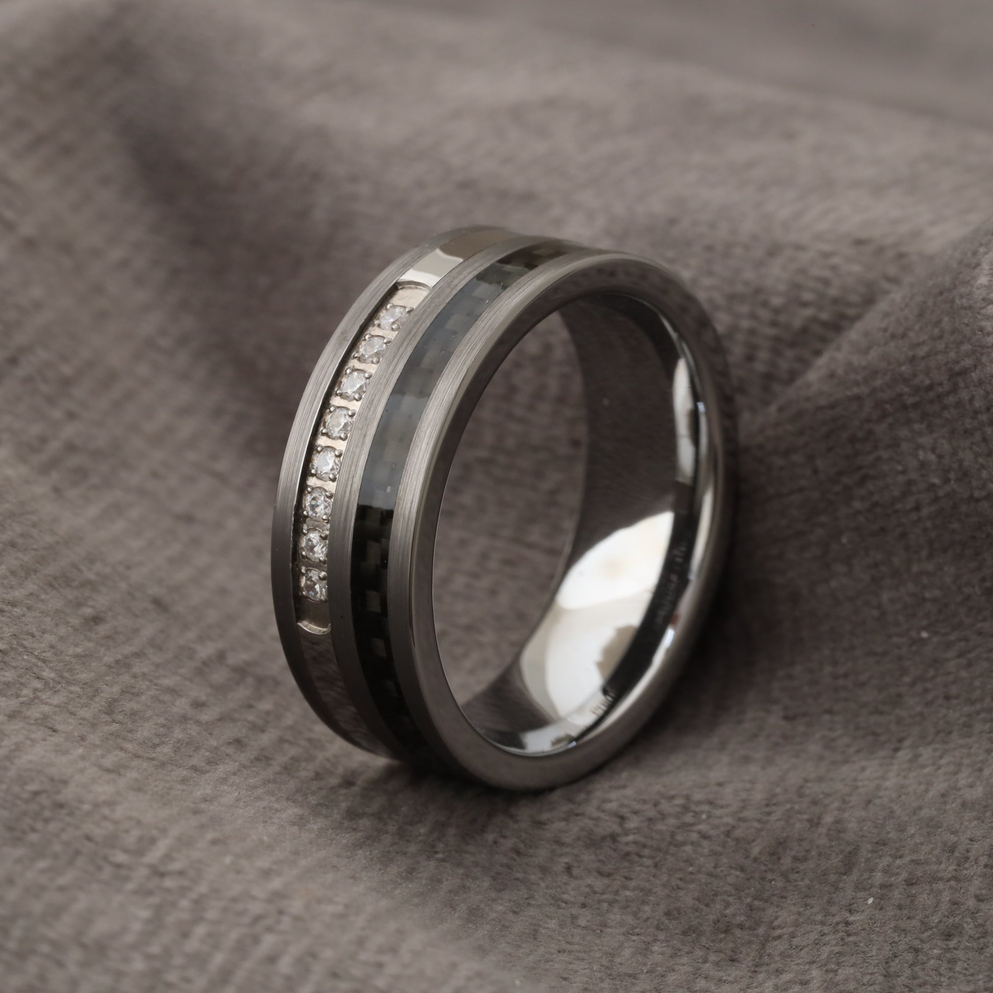 💎 دبلة التنجستين المطعمة بكاربون فايبر أسود والمرصعة بفصوص المايكرو زيركون الأبيض - تحفة من الفخامة والأناقة