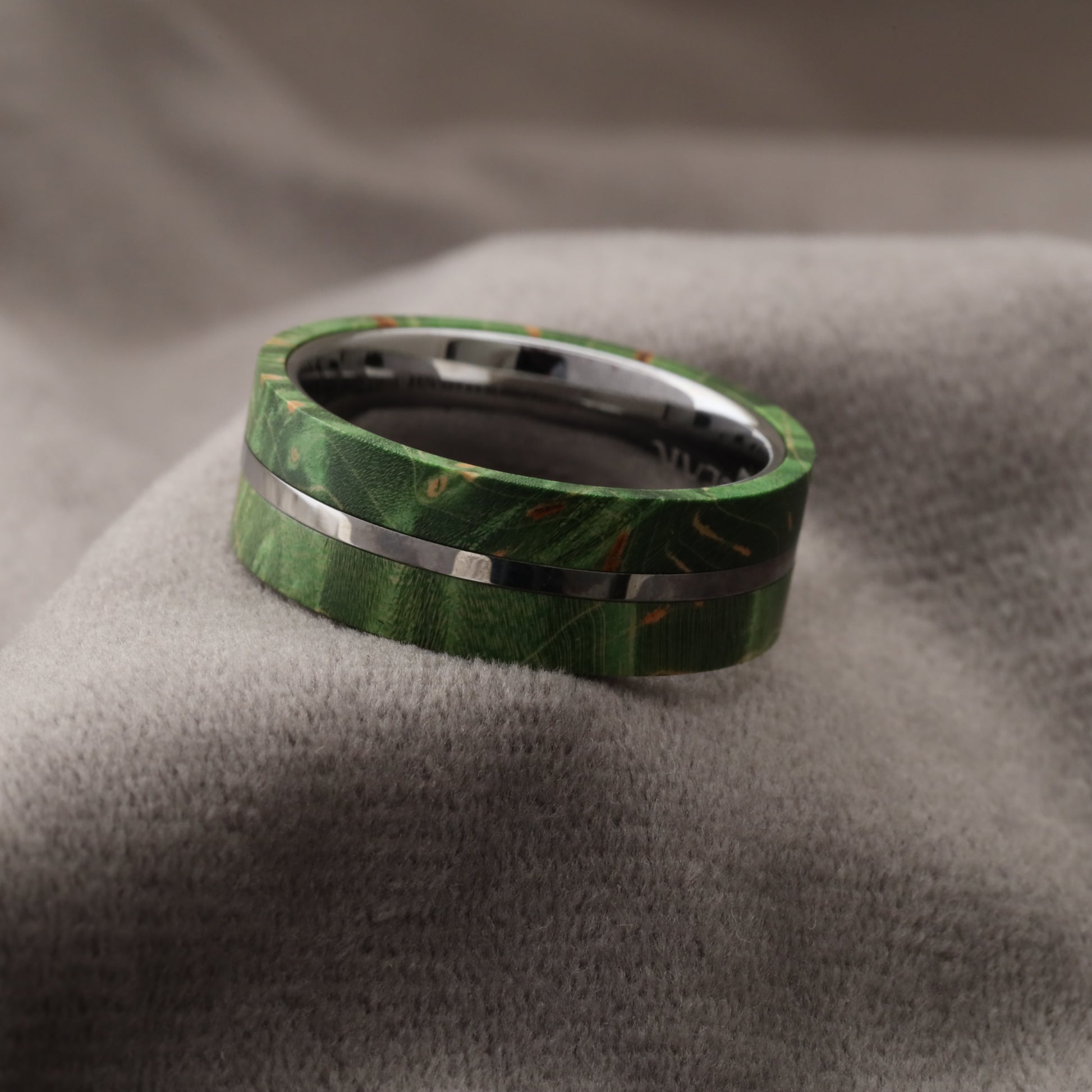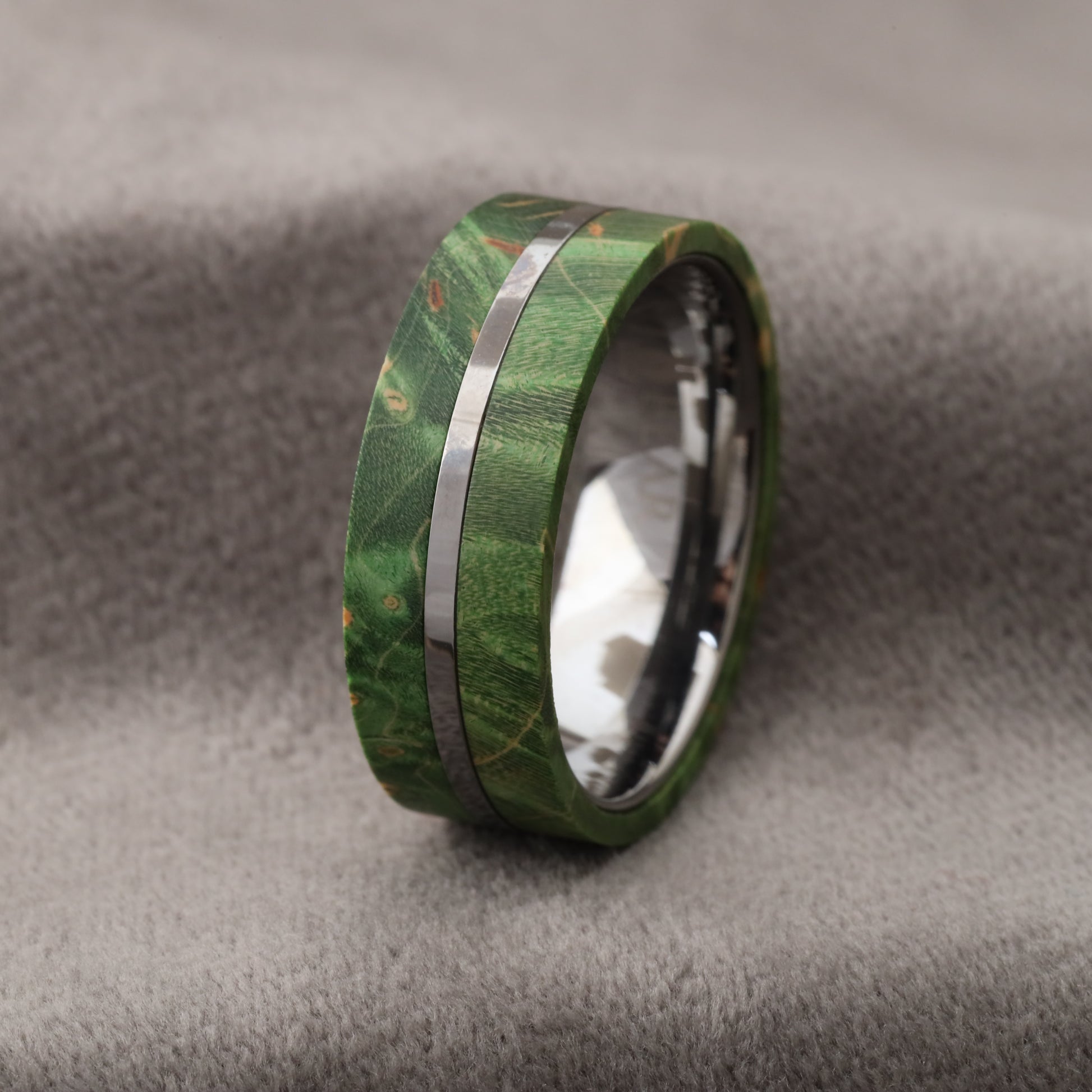 اكتشف الجمال الطبيعي في هذه الدبلة الاستثنائية التي تجمع بين قوة التنجستين وجمال خشب Elder Box الأخضر النادر بتفاصيله الطبيعية المذهلة.