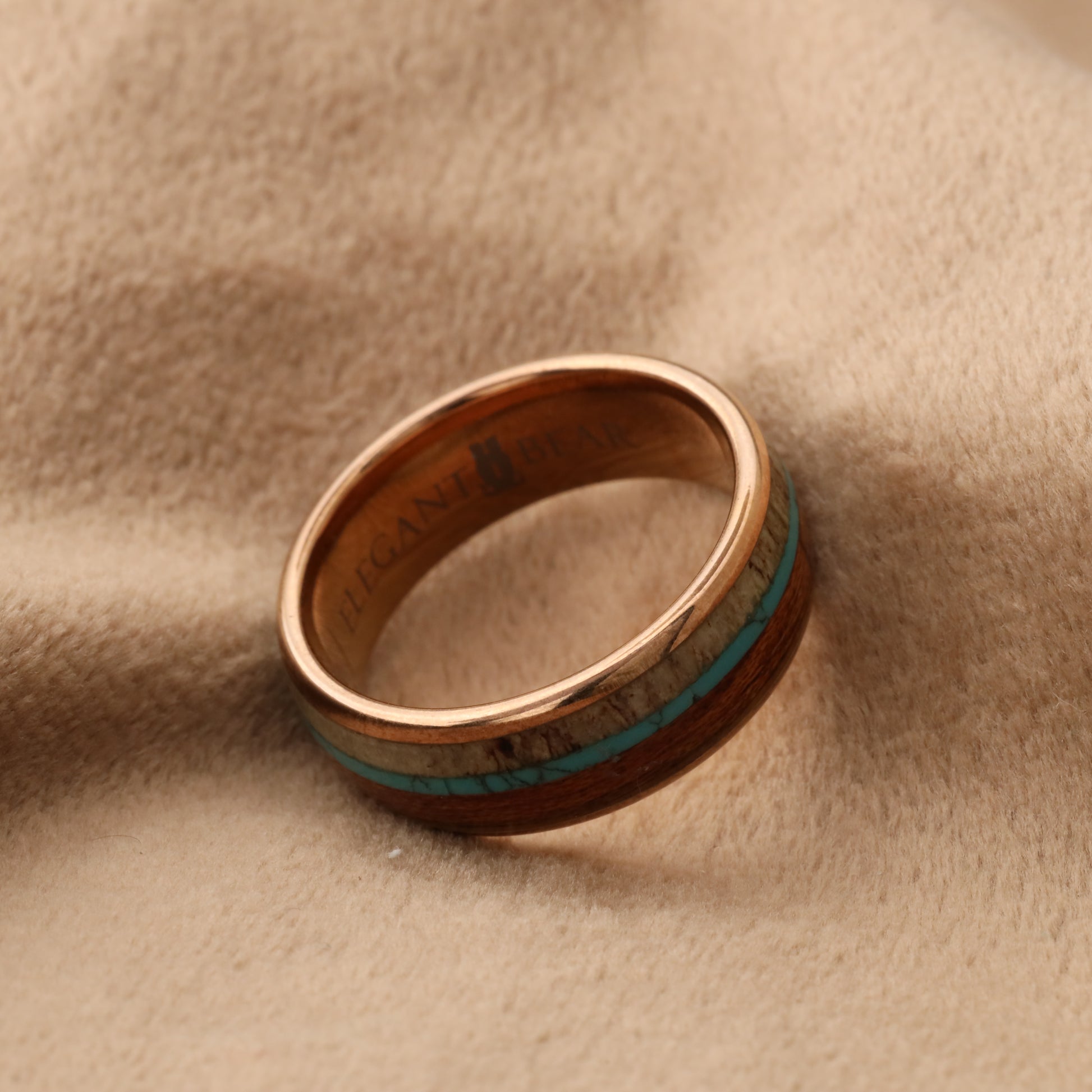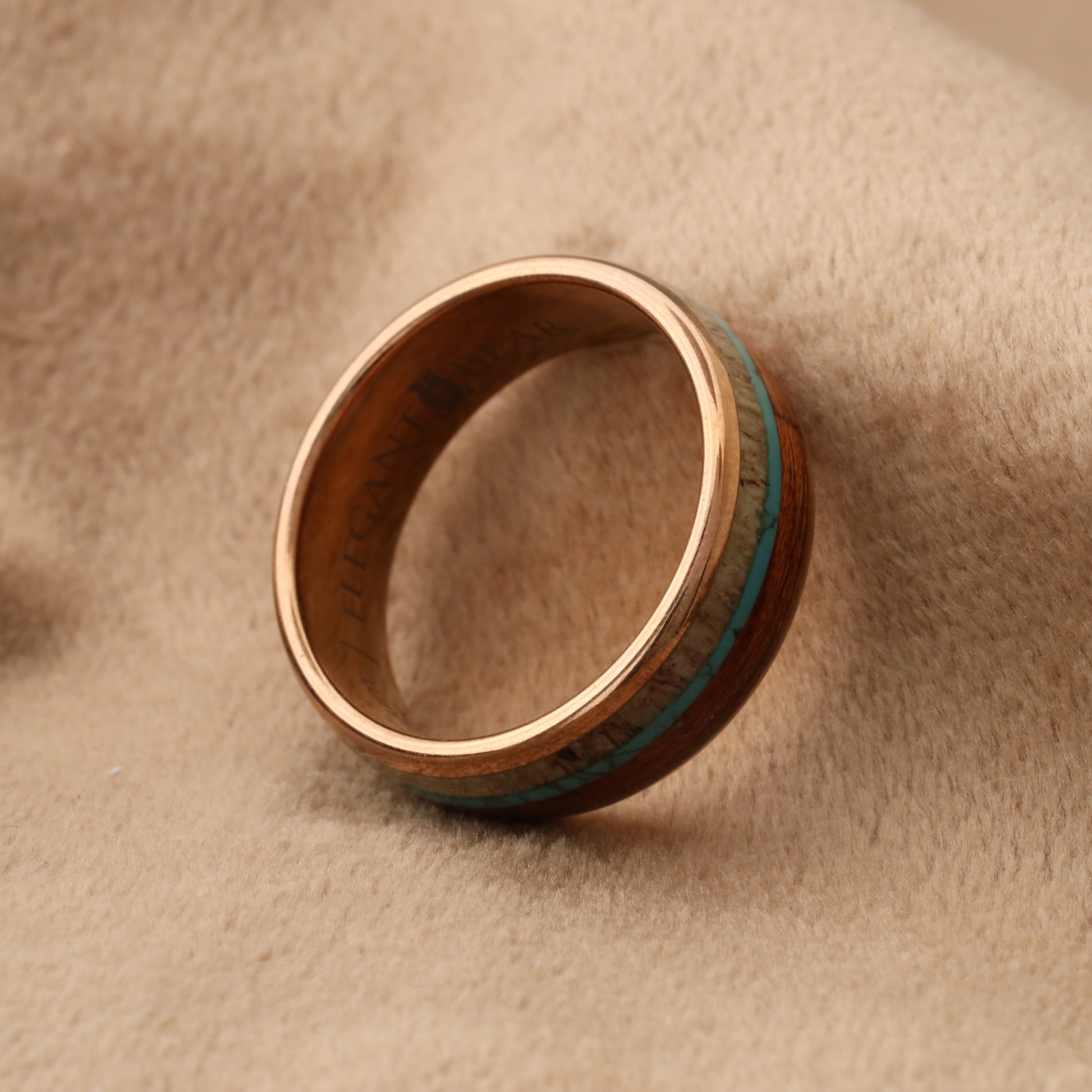 دبلة استثنائية من التنجستين مطعمة بخشب الكوا الطبيعي وعاج الغزلان الطبيعي وحجر الفيروز الكريم - تصميم ثلاثي طبيعي فريد