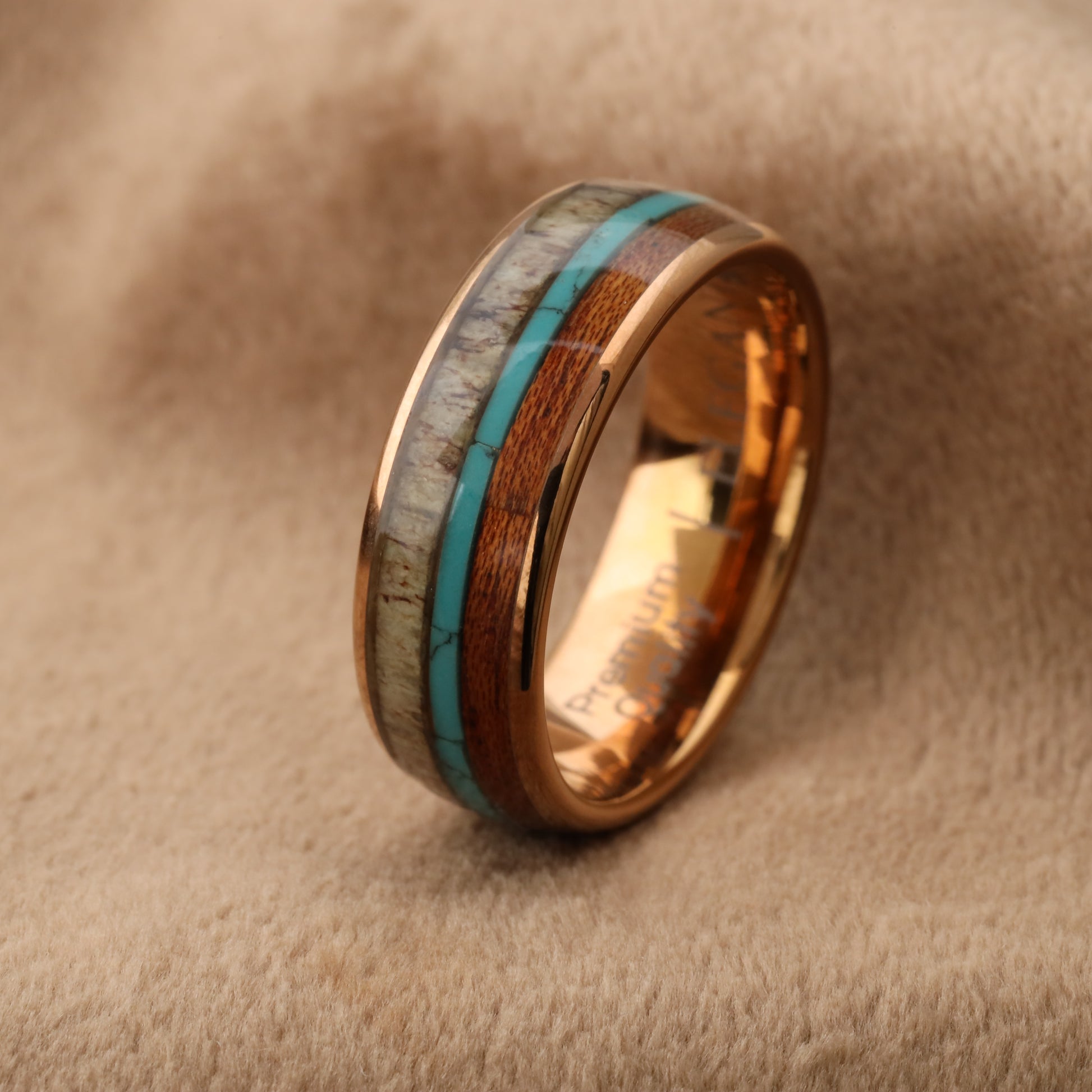 Tungsten Ring with Koa Wood, Deer Antler & Turquoise Stone - Triple Natural Inlay - 8mm - A111